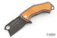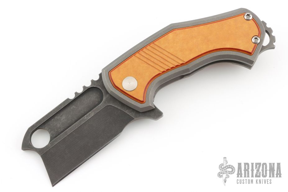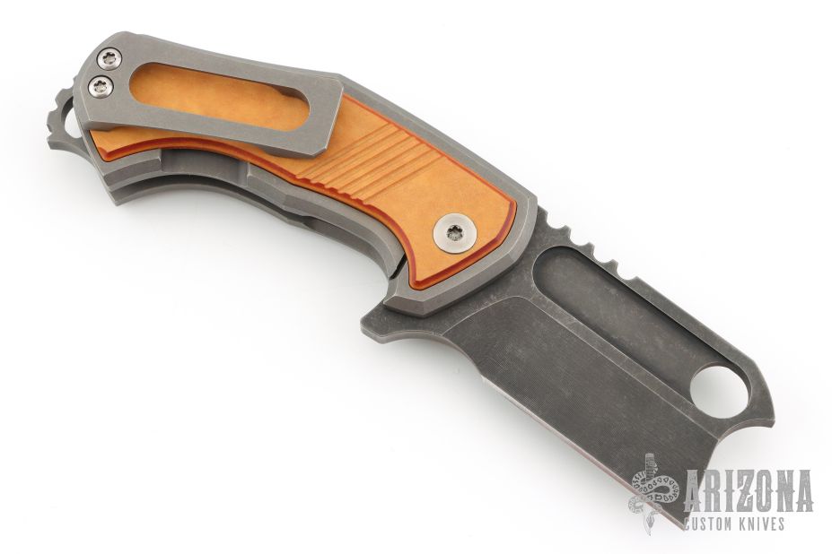 This Orphan S by Eric Luther features an acid stonewashed blade with milled fullers, hole in blade, notched thumbrest, and flipper. The handle has a tumbled titanium frame with Richlite inlays, matching titanium backspacer with lanyard hole, and tip up clip. Comes with zipper case and COA dated 10/22/23. Nice detent, lockup and blade seating. Excellent condition.