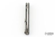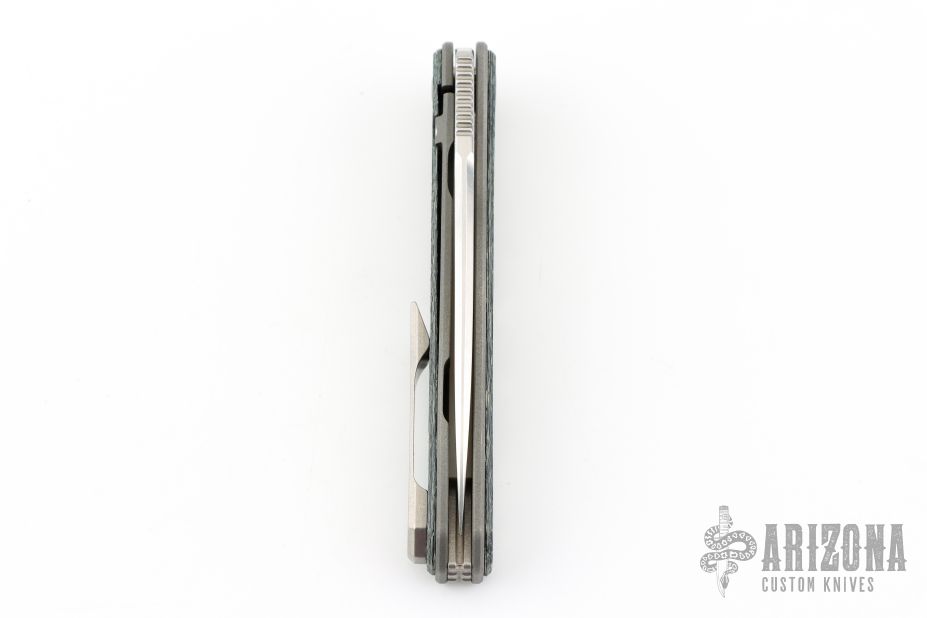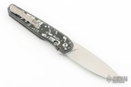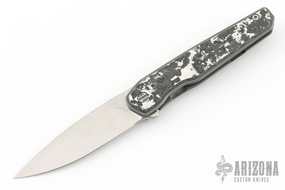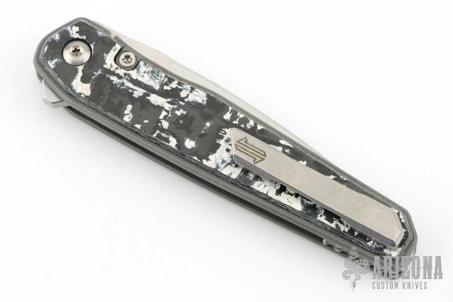 This LHC-X by Brown Knives features a drop point stonewashed blade with notched thumbrest and flipper. The handle has fat carbon scales, stonewashed titanium liners, backspacer and tip up clip with hidden screws. Rides on bearings, nice detent, lockup and blade seating. Comes with original box and COA #225. Excellent condition.