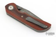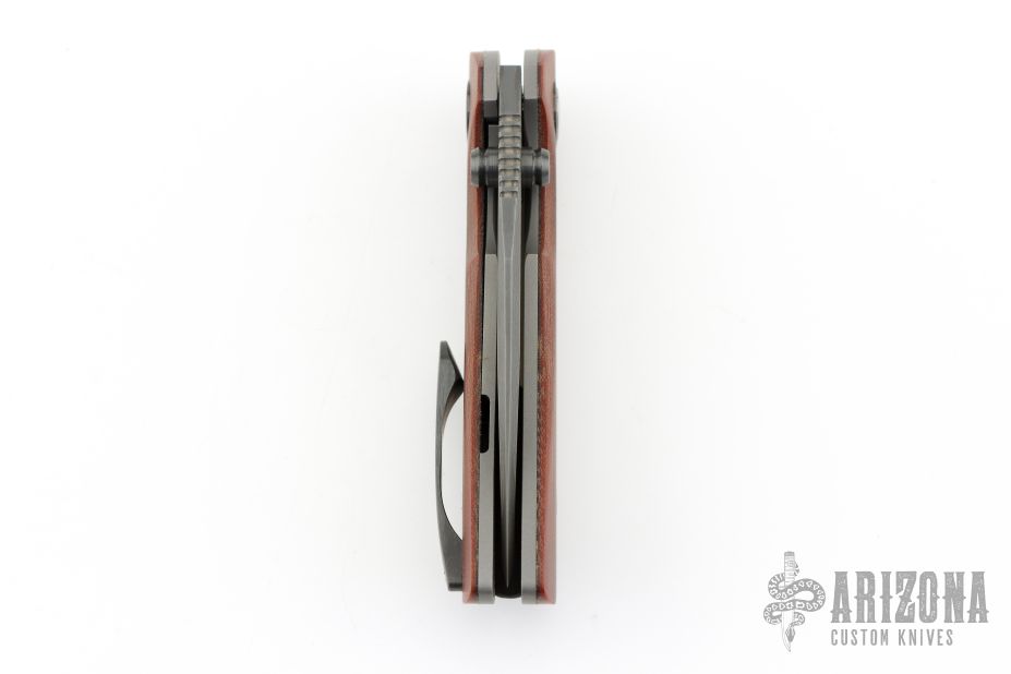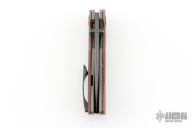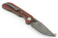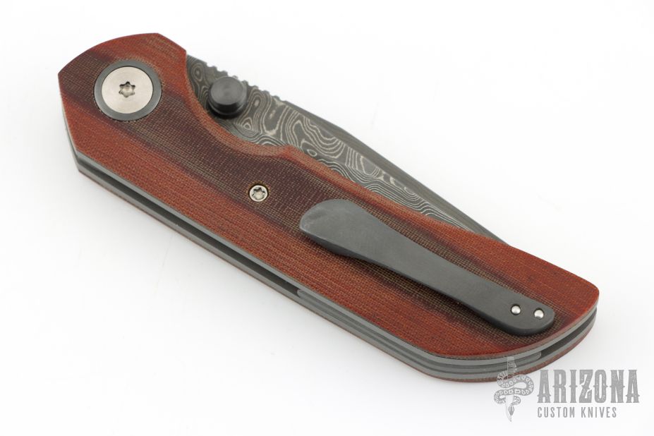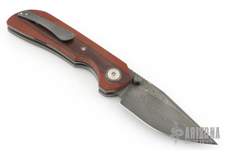 This New Unnamed by Steve Dumchus features a Ripple pattern San Mai Damascus blade with notched thumbrest and dual zirconium thumbstuds. The handle has a vintage micarta scales, bead blasted titanium liners, San Mai Damascus backspacer, zirconium pivot collars and tip up clip. Nice detent, lockup and blade seating. Excellent condition. Comes with COA dated 01/2025. Comes with a zippered case.