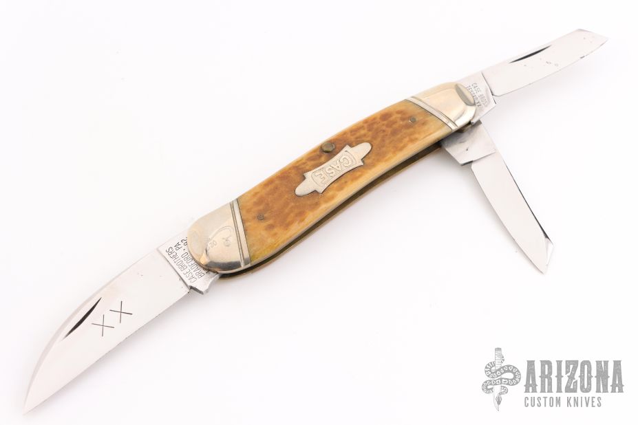 This knife by Case features mirror finished blades with nail nicks. The handle has nickel silver bolsters, jigged bone covers, brass liners and steel springs. Marked #022 on the bolster. Has some light scratches and patina. Excellent condition otherwise.