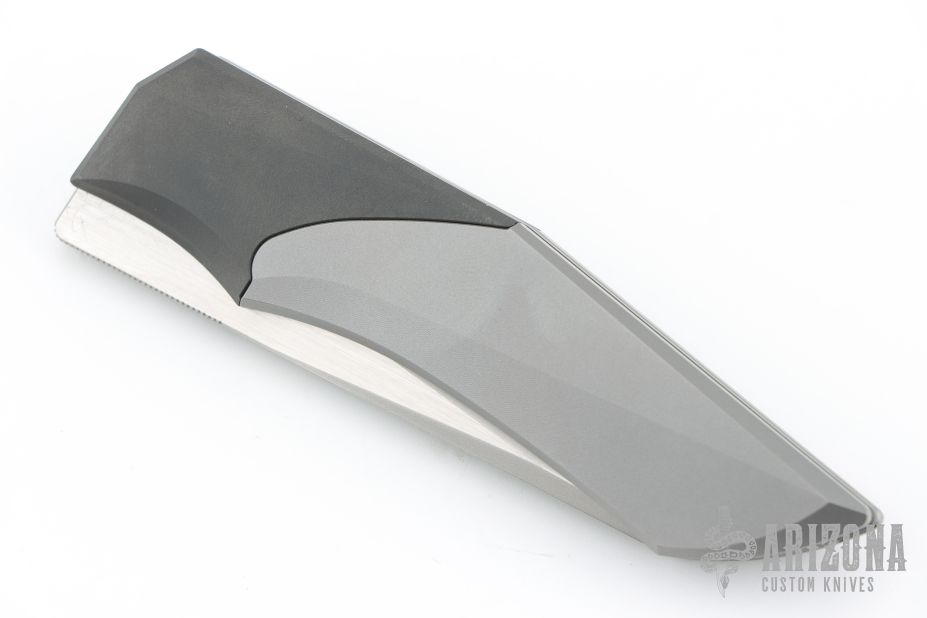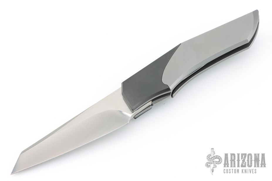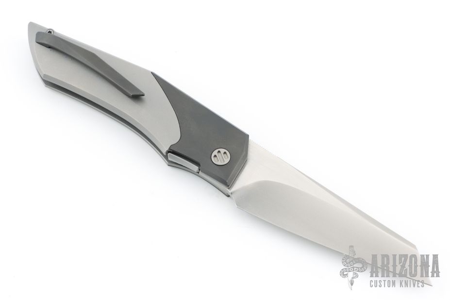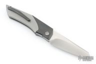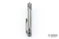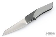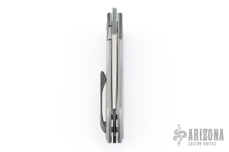 This knife features a sheepsfoot style blade with a notched thumbrest/front flipper.  The handle has a two-tone titanium frame with a titanium tip up pocket clip and floating backspacer.  Includes the original box and papers.  Excellent Condition.