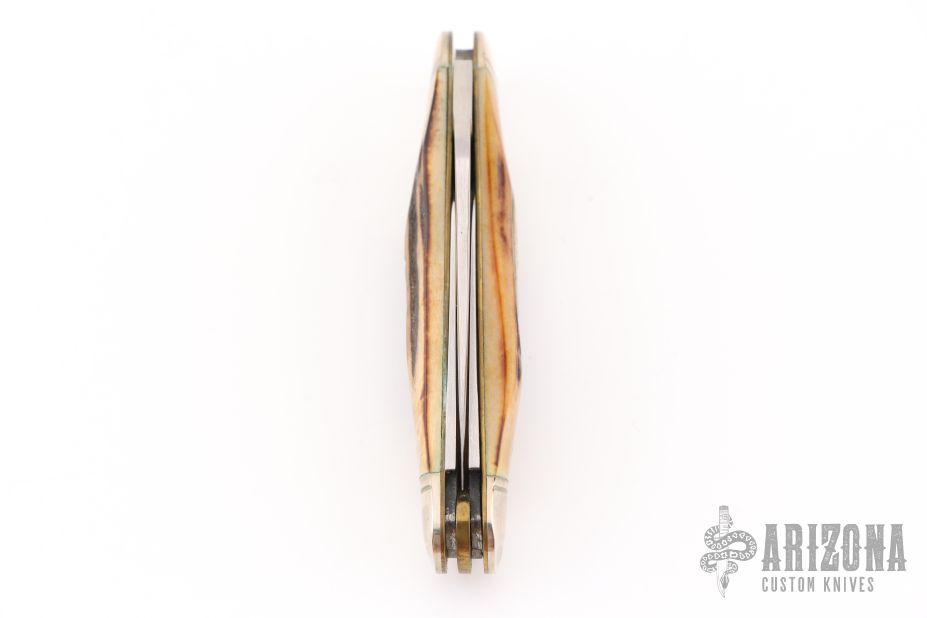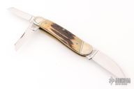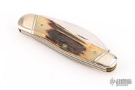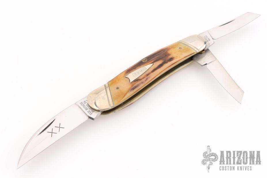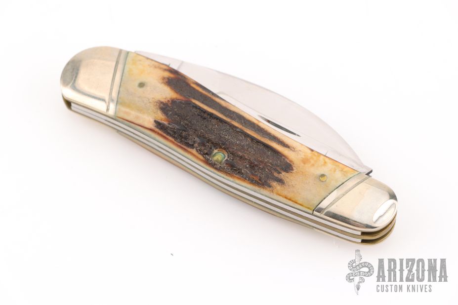 This knife by Case features mirror finished blades with nail nicks. The handle has nickel silver bolsters, stag covers, brass liners and steel springs. Has some light scratches and patina. Excellent condition otherwise. Marked #0000 on the bolster.