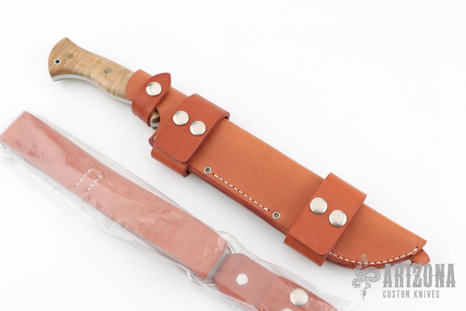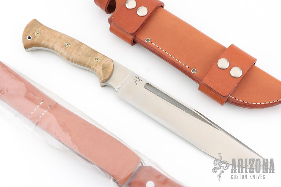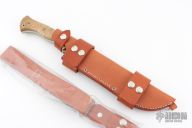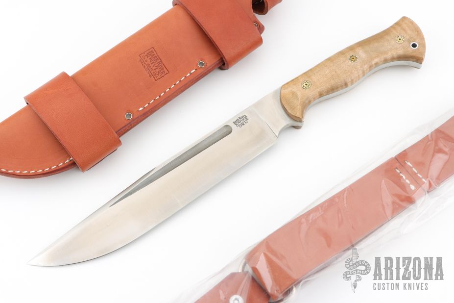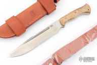 The Bark River Grizzly is a collaboration between Mike Stewart and Peter Kohler of Dark Timber Knives. The Grizzly is the flagship of the Dark Timber line and has been Peter's signature knife. The knife is co-branded with the Bark River logo on the front of the blade. Has curly maple scales with mosaic pins. Satin finished blade with fullers and false top edge, .274" blade stock and 1.534" blade depth, full tang construction. Comes with brown leather sheath. Excellent condition.