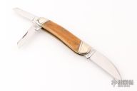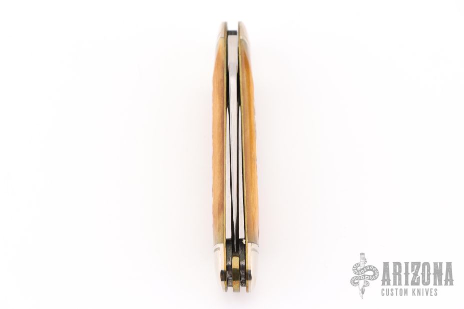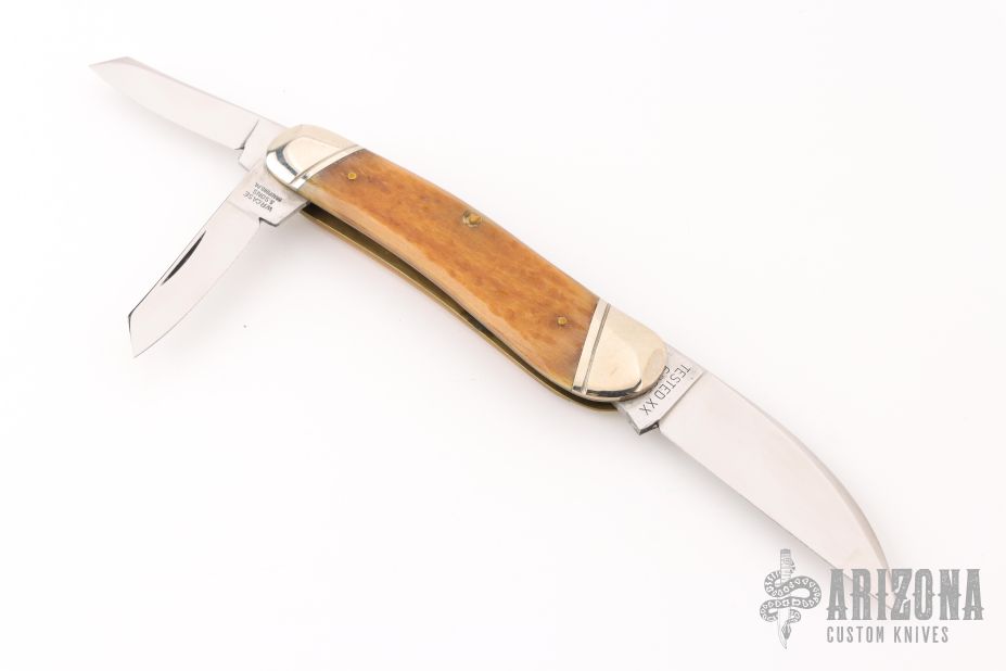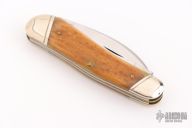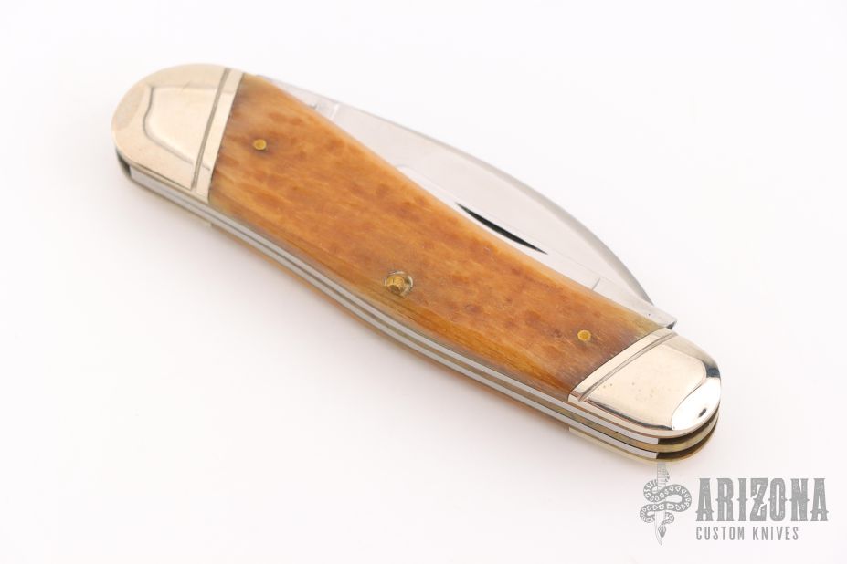 This knife by Case features mirror finished blades with nail nicks. The handle has nickel silver bolsters, jig bone covers, brass liners and steel springs. Marked #0000 on the bolster. Has some light scratches and patina. Excellent condition otherwise.