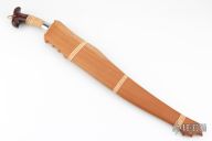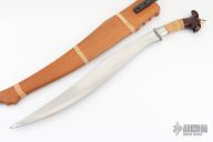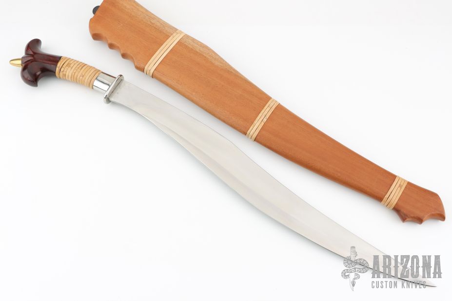 It has a satin finished blade with .234" blade stock and 1.858" blade depth, hidden tang construction. The handle has a stainless steel guard and collar, carved wood butt with rattan wrapped grip, brass finial. Comes with a wooden scabbard with rattan wrap. Excellent condition.