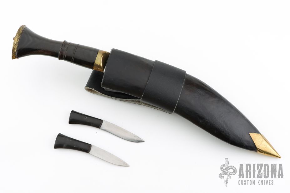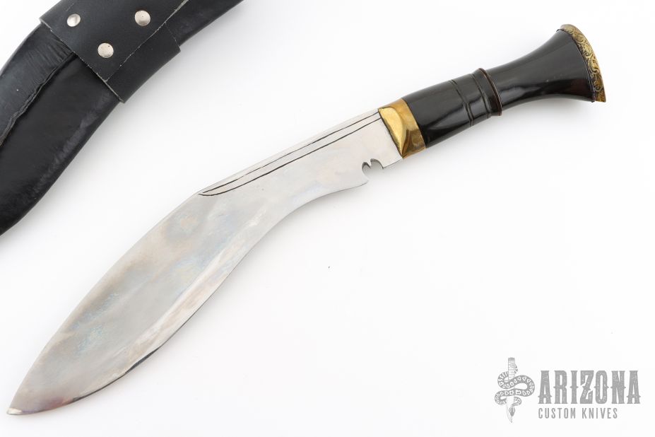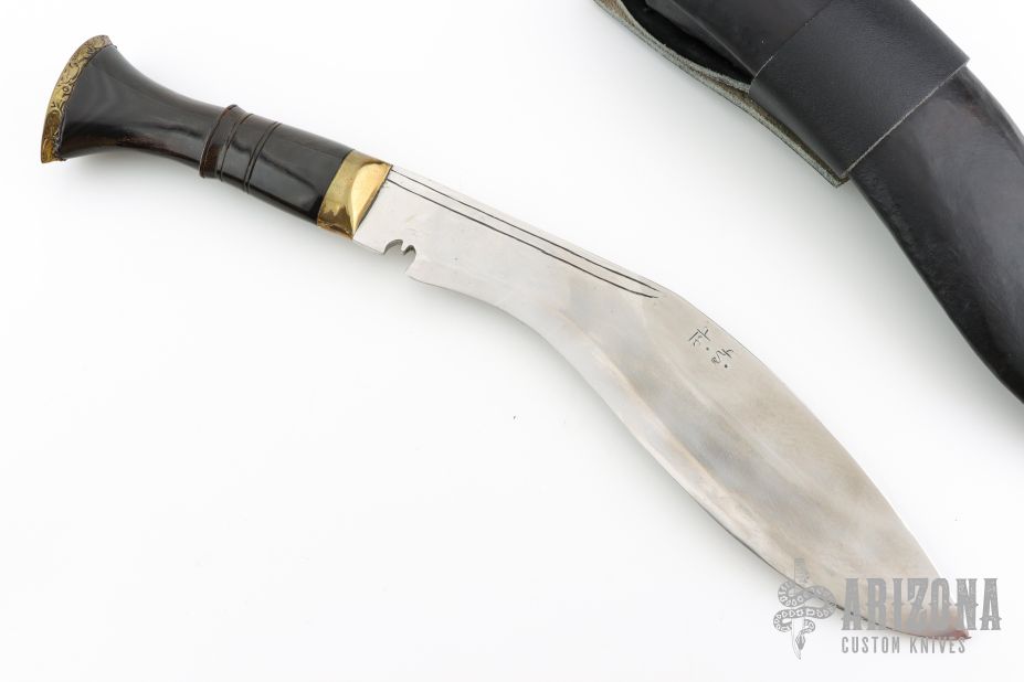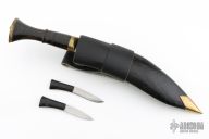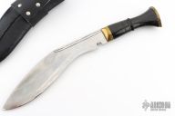 This Khukri by Himalayan Imports features a satin finished blade with fullers, .511" blade stock and 2.145" blade depth, hidden tang construction. The handle has a brass guard and engraved butt, fluted water buffalo bone grip. Comes with a black leather covered wooden scabbard with two smaller blades in the sheath. Has some light scratches, otherwise excellent condition.