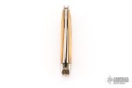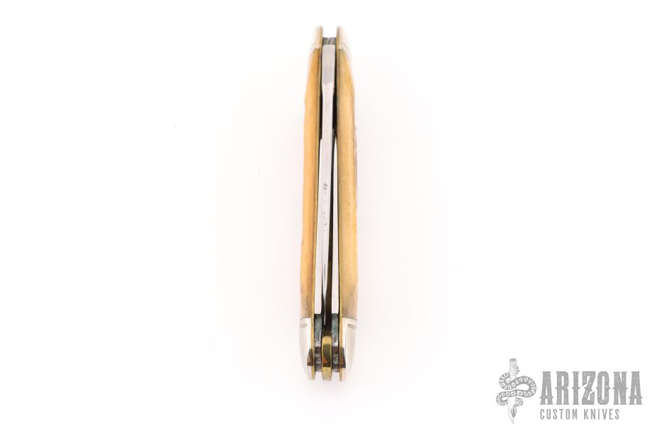 This knife by Case features mirror finished blades with nail nicks. The handle has nickel silver bolsters, jig bone covers, brass liners and steel springs. Marked #0000 on the bolster. Has some light scratches and patina. Excellent condition otherwise.