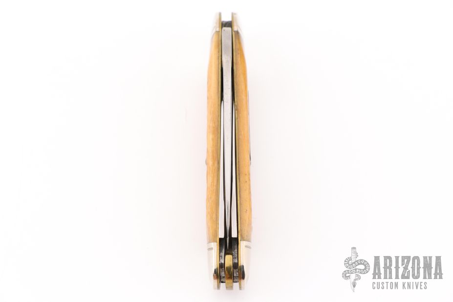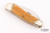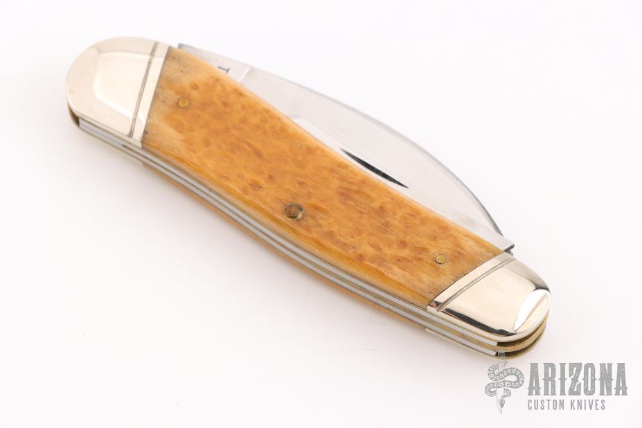 This knife by Case features mirror finished blades with nail nicks. The handle has nickel silver bolsters, jig bone covers, brass liners and steel springs. Marked #0000 on the bolster. Has some light scratches and patina. Excellent condition otherwise.