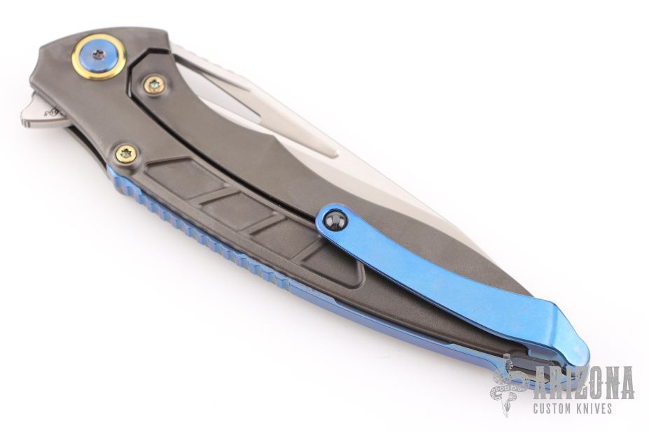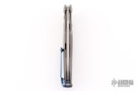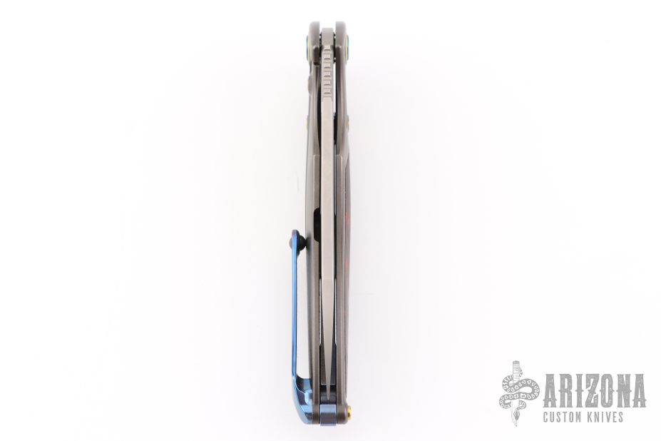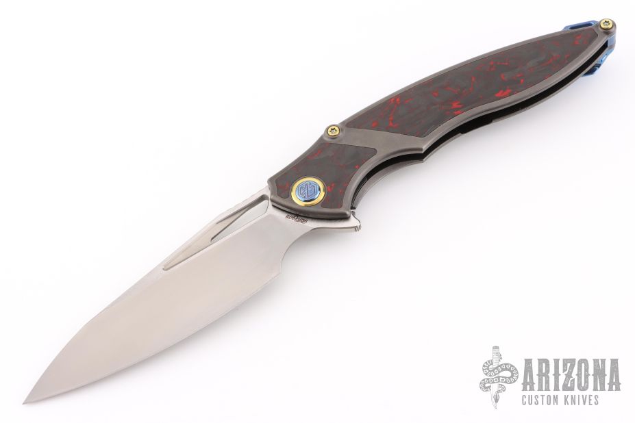 This RK1902 Flipper by Rike Knife features a two tone finish satin/blasted drop point blade with swedge, notched thumb rest and flipper. The handle has machined and bead blasted titanium frame with matching tip up clip. Red carbon fiber inlays. Stainless steel lock face insert. Lanyard bale in backspacer. Includes box, padded and zippered case. #693. Excellent condition.