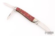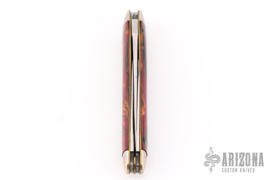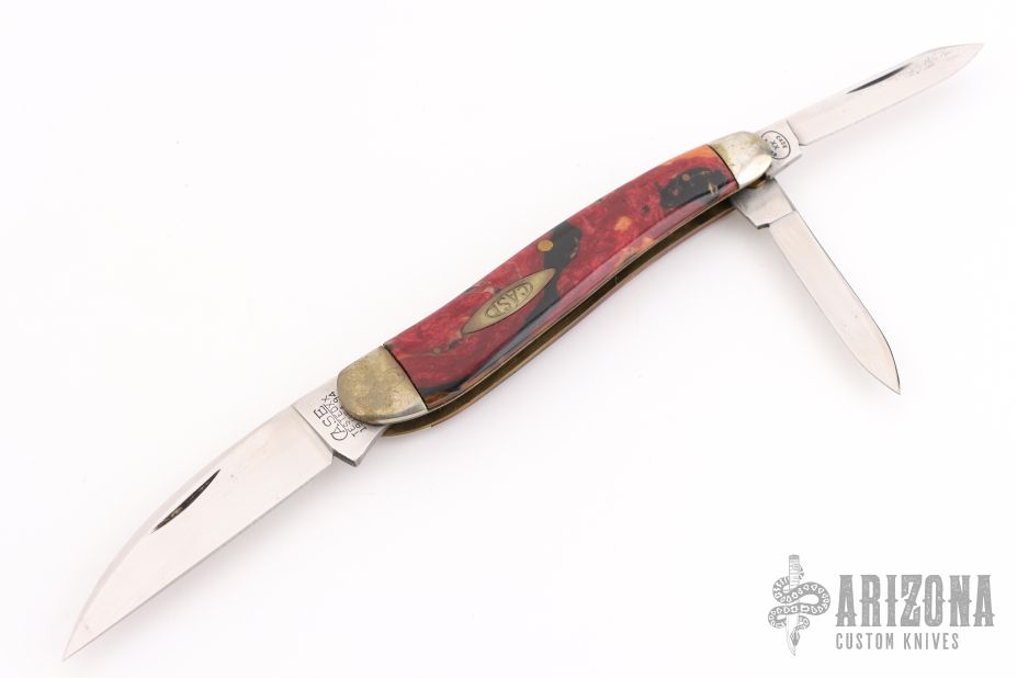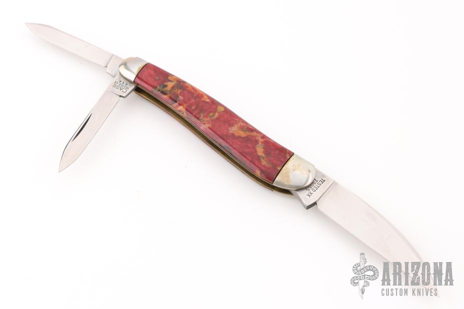 This knife by Case features mirror finished blades with nail nicks. The handle has nickel silver bolsters, acrylic covers, brass liners and steel springs. Marked #0000 on the bolster. Has some light scratches and patina. Excellent condition otherwise.