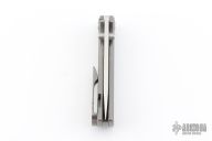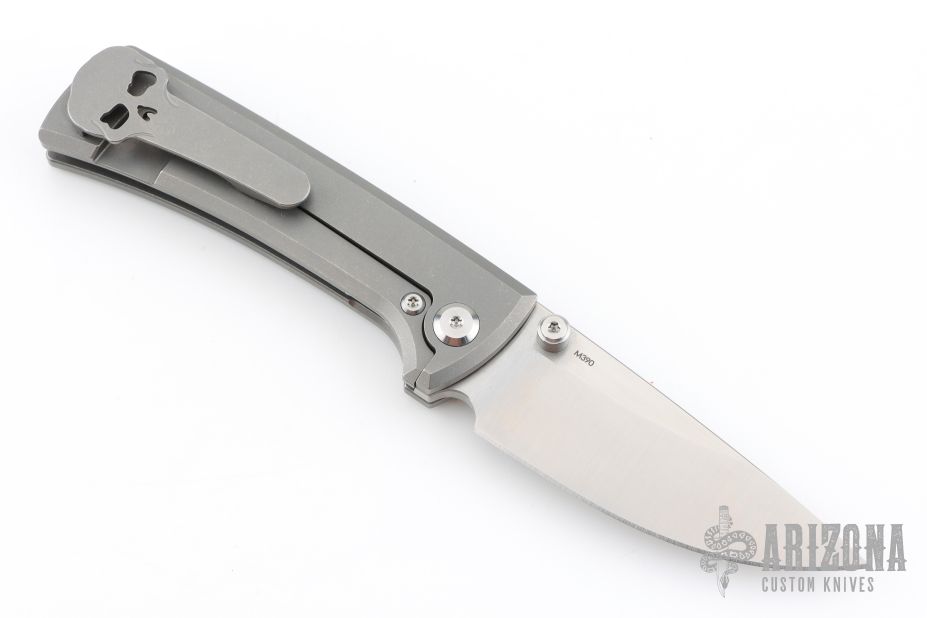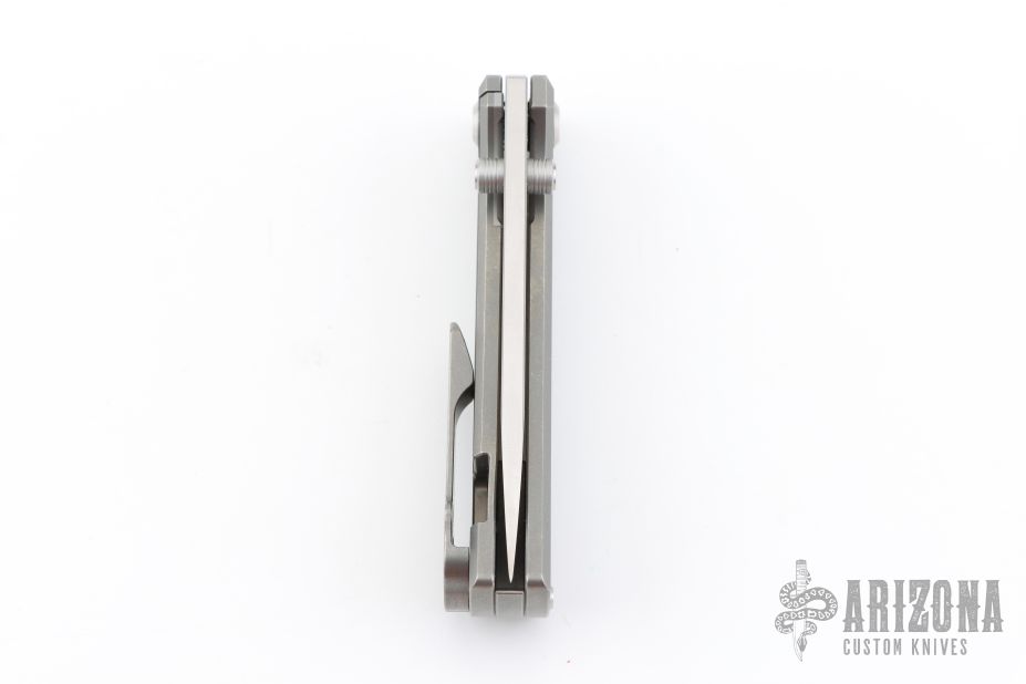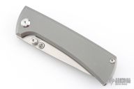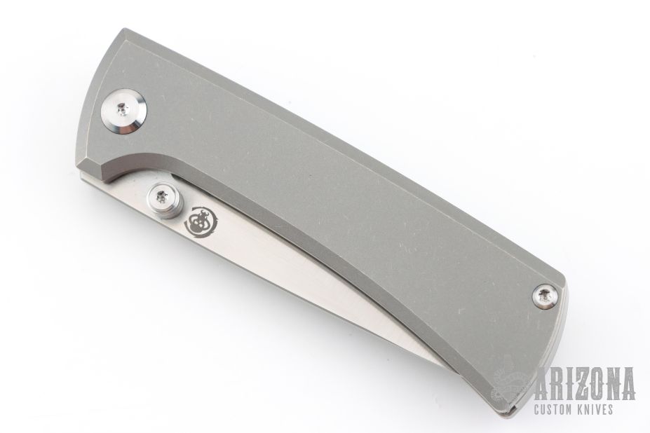 This Chaves RCK9 Drop point features a satin finished blade with the Chaves logo. The handle is made up of tumbled titanium, skull pocket clip (positioned for tip up carry), and a matching titanium backspacer. Comes with original box and an extra pocket clip.  Excellent Condition.