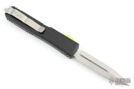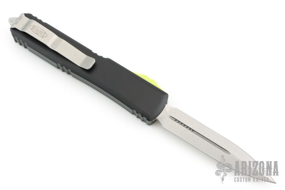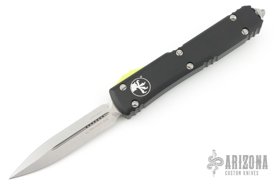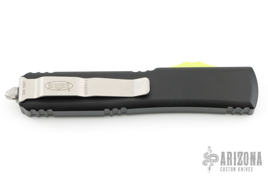 This Ultratech OTF automatic by Microtech knives features a D/E stonewashed double edged blade blade with a standard edge, and a black aluminum handle with a neon yellow button, tip down carry. Glass breaker. S/N 1991. Dated 02/2023. Comes with original box and papers. Excellent Condition.