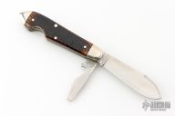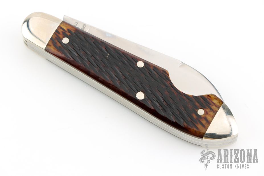 This Easy Open Jack by Great Eastern Cutlery features a satin finished blade with long pull and bottle opener with nail nick. The handle has nickel silver bolsters, groove bone horn covers, silver liners and steel springs. Has half-stops. Comes with original tube and wax paper. Has some light scuffs and scratches, otherwise Excellent condition.
