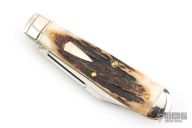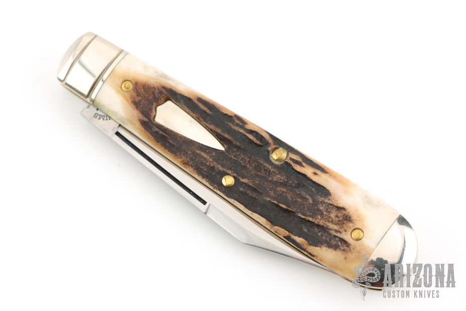 This Stag Jack by Great Eastern Cutlery features a satin finished blade with long pull and swedge. The handle has nickel silver bolsters and butt, stag covers with brass liners, and a stainless steel spring. Has half-stop, flush in the open and closed positions. Comes with original tube and wax paper. Has some light scratches, otherwise Excellent condition.