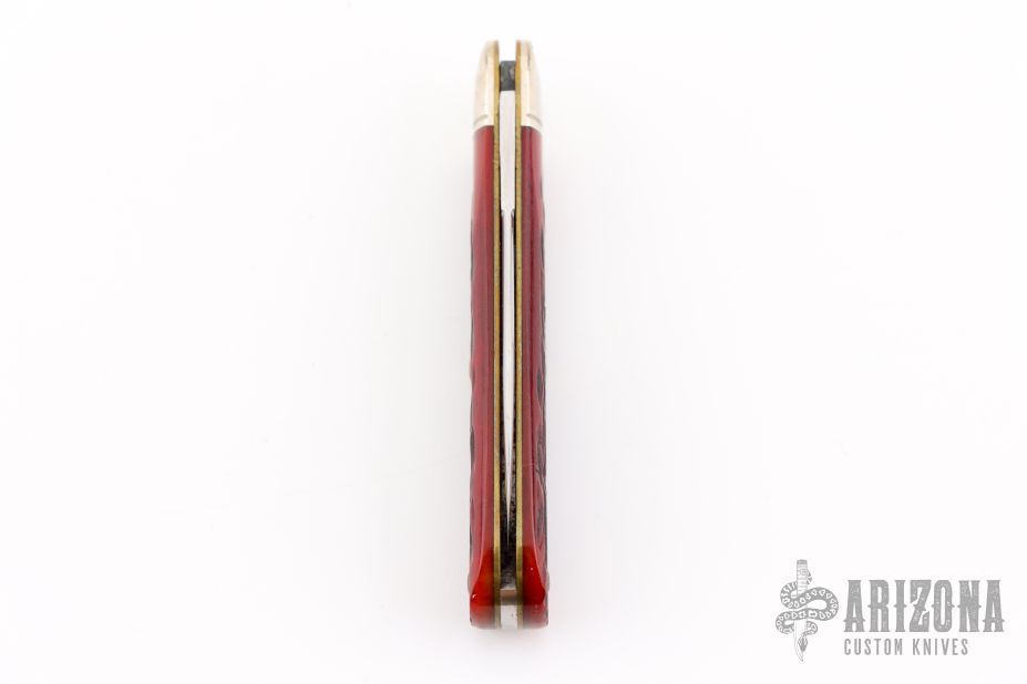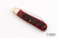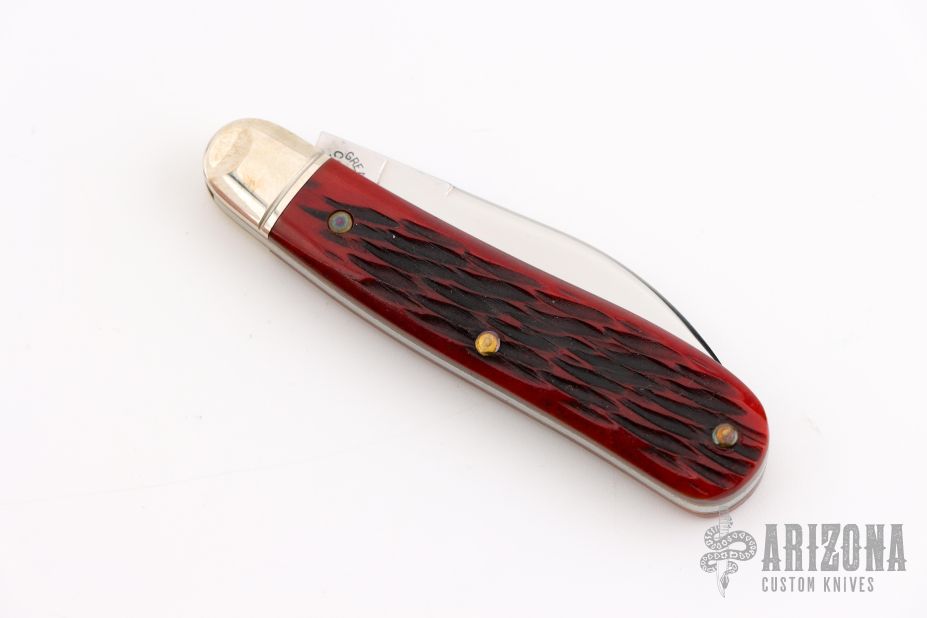 This Coyote by Great Eastern Cutlery features a mirror finished blade with nail nick. The handle has pinched and fluted nickel silver bolsters and brass liners, Sangria jigged bone covers, brass liners and steel spring. Has half-stop. Comes with original tube. Excellent condition.