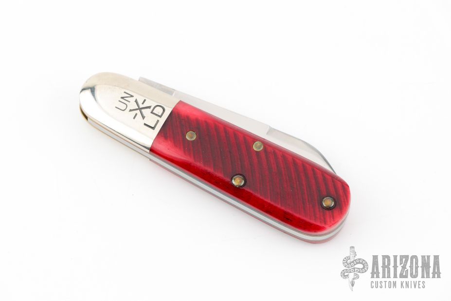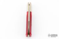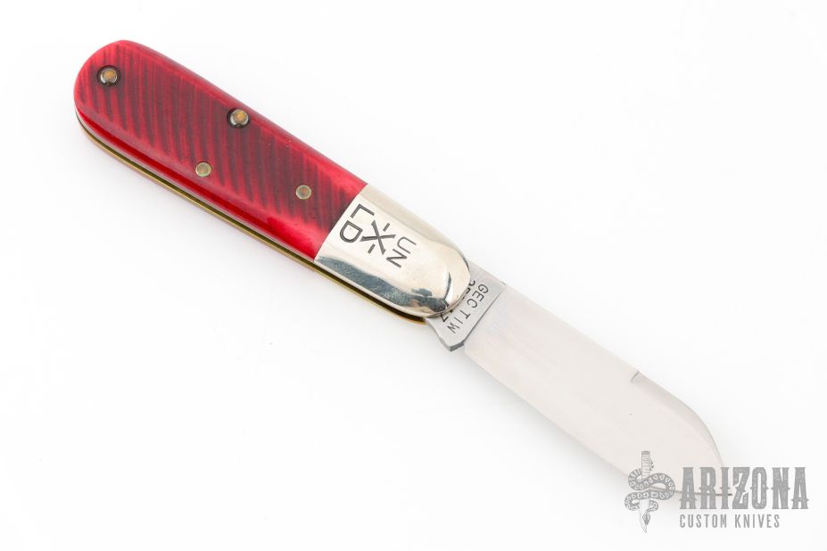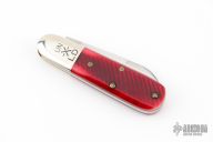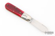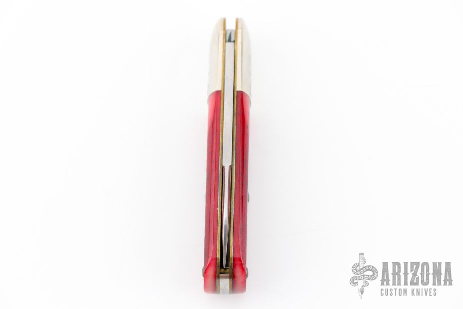 This Little Jack slipjoint by Great Eastern Cutlery features a satin finished blade with nail nick. The handle has nickel silver bolsters, blood red saw cut bone covers, brass liners and a steel spring. Has half-stop. Includes original tube. Excellent condition. 150 were made