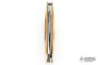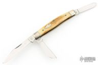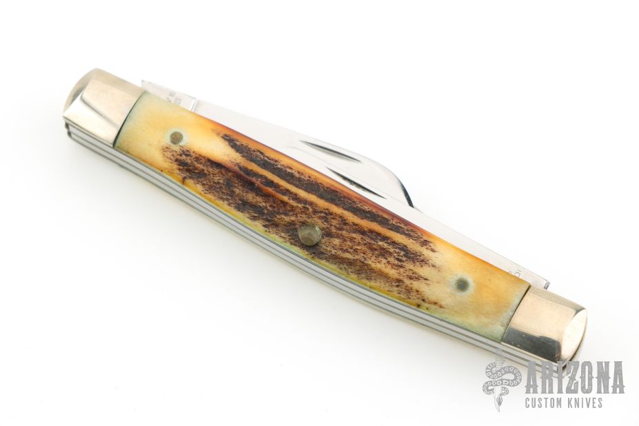 This Northwoods Knives Medium Stockman features 3 mirror polished blades with nail nicks. The handle has nickel silver bolsters and cap, stag covers with nickel silver arrow head escutcheon, brass liners and stainless steel springs. Has some scratches, and patina. Great condition otherwise.