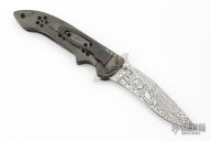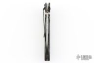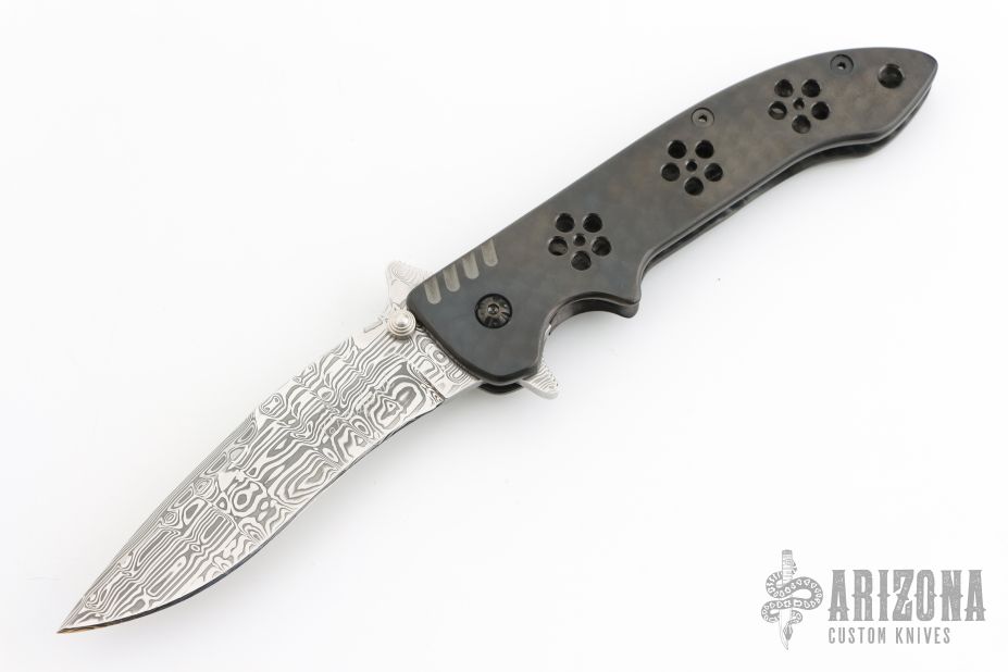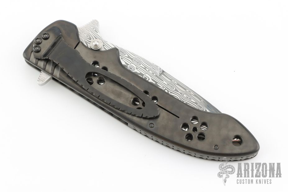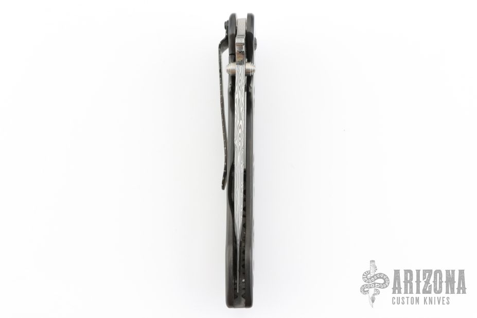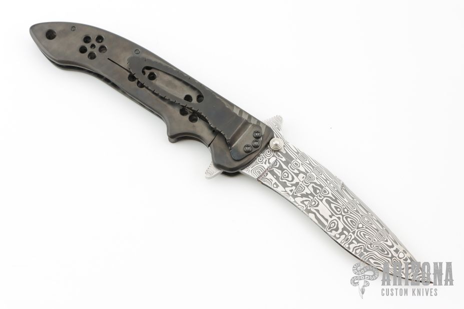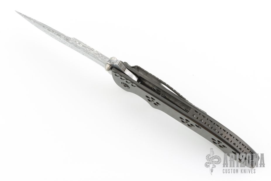 This Dressed Perfigo folder from Crawford Knives features a Damasteel blade with dual thumb studs, notched thumbrest and flipper. The handle has a black jeweled titanium frame, fileworked black stainless steel backspacer, and a tip down fileworked black titanium clip. Smooth action with a nice detent and lockup. Excellent condition. Comes with a zippered case.