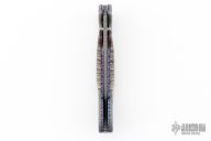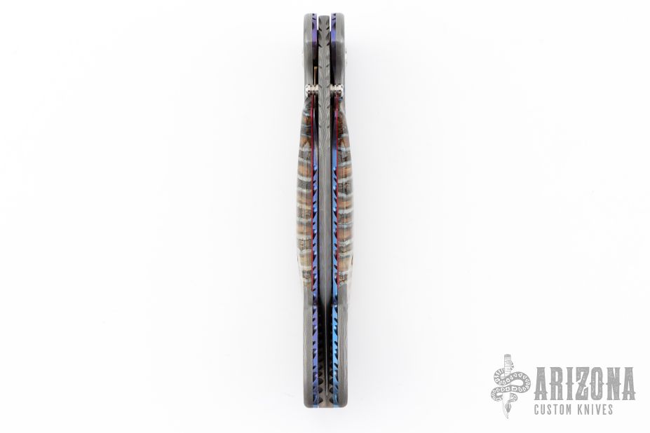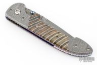 This Perfigo folder from Crawford Knives features a Damascus blade with dual blue stone inlaid thumbstuds, and false top edge and fileworked spine. The handle has dovetailed Damascus bolsters, mammoth tooth scales with red liners, fileworked and anodized titanium liners with jeweled interiors, fileworked stainless steel backspacer. Nice detent, blade seating and lockup. Comes with padded zippered case. Excellent condition.
