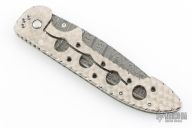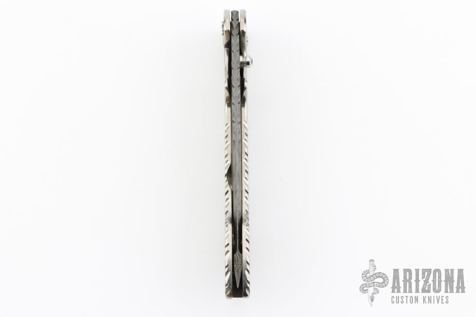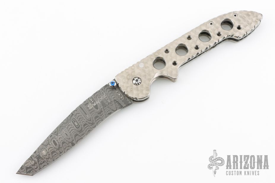 This Dressed Perfigo folder from Crawford Knives features a Damascus tanto blade with a single blue stone inlaid thumbstuds, false top edge and fileworked thumbrest. The handle has a jeweled titanium frame, fileworked Damascus backspacer. Has screws for a 3-hole clip, tip down carry. Smooth action with a nice detent, blade seating and lockup. Excellent condition. Comes with a zippered case.