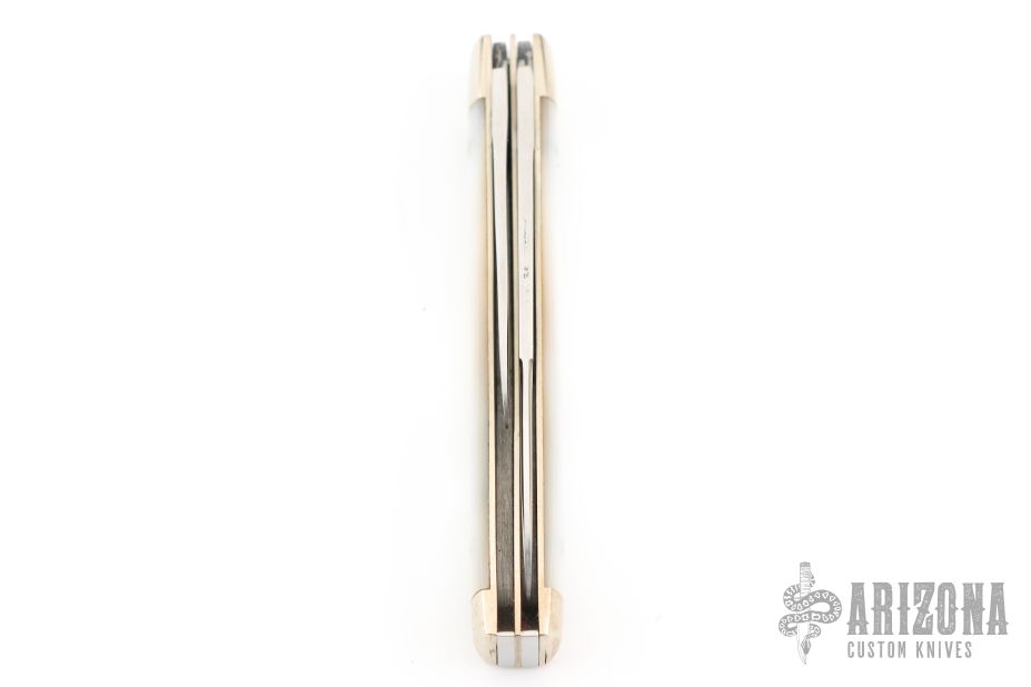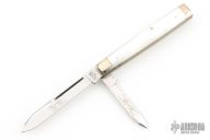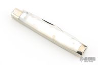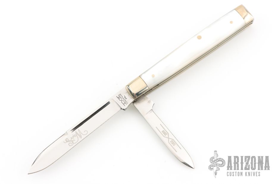 This knife by Schatt & Morgan features 2 mirror polished blades with long pull and nail nick. The handle has nickel silver bolsters, nickel silver liners, pearl covers and stainless springs.  Includes the original box.  Has some light scratches, Excellent Condition.