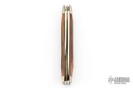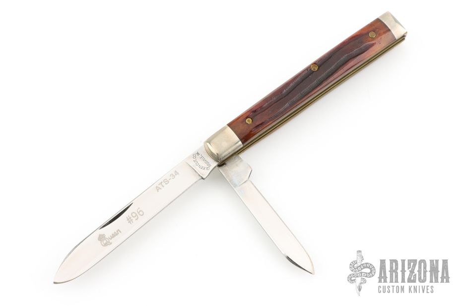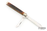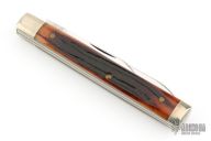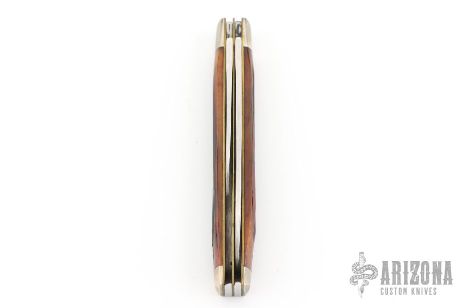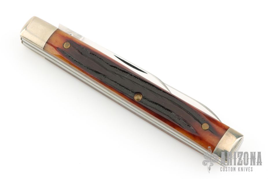 This knife by Schatt & Morgan features 2 mirror polished blades with nail nicks. The handle has nickel silver bolsters, brass liners, groove bone covers and stainless springs.  Includes the original box.  Has some light scratches, Excellent Condition.