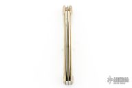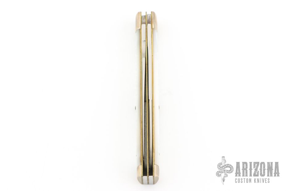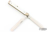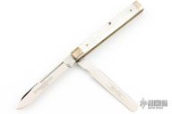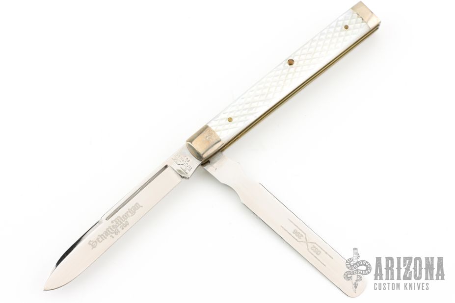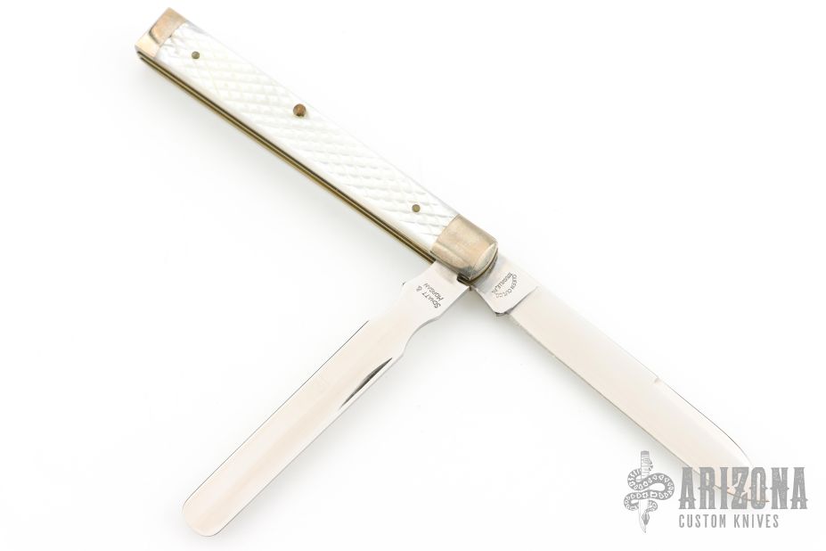 This knife by Schatt & Morgan features 2 mirror polished blades with long pull and nail nick (one is a spatula). The handle has nickel silver bolsters, nickel silver liners, checkered pearl covers and stainless springs. Has some light scratches, Excellent Condition.