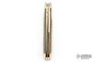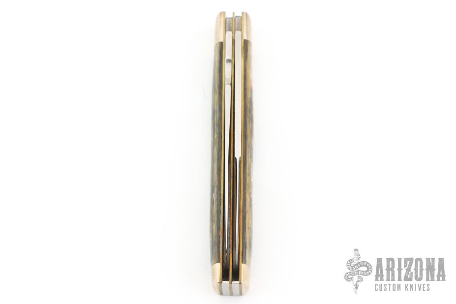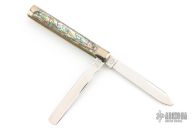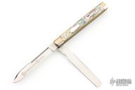 This knife by Schatt & Morgan features 2 mirror polished blades with long pull and nail nick (one is a spatula). The handle has nickel silver bolsters, brass liners, abalone covers and stainless springs. Has some light scratches, Excellent Condition.