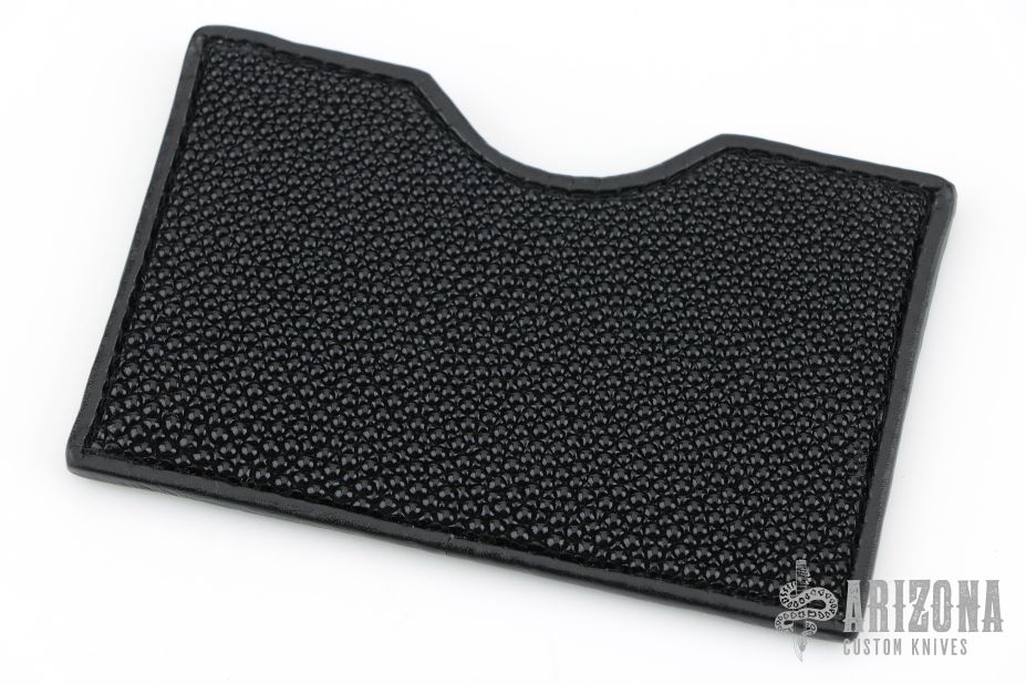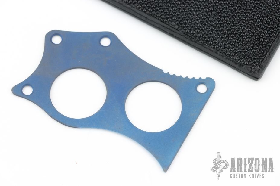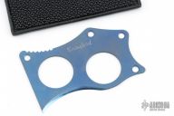 This credit card karambit by Crawford Knives features an anodized and bead blast finished titanium hawkbill blade and handle. Fits in the credit card slot of a wallet. Comes with a black stingray skin card holder. Excellent condition.