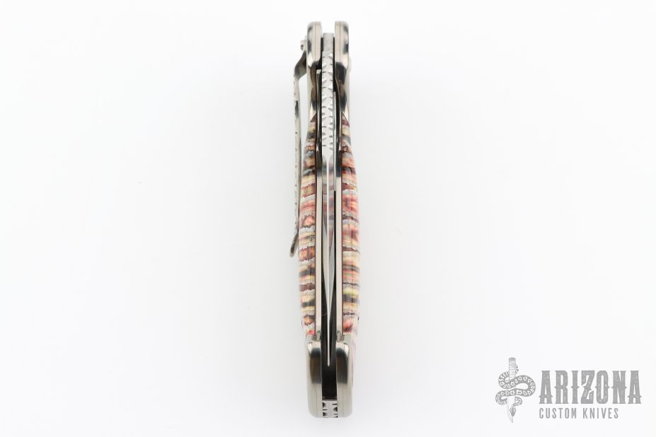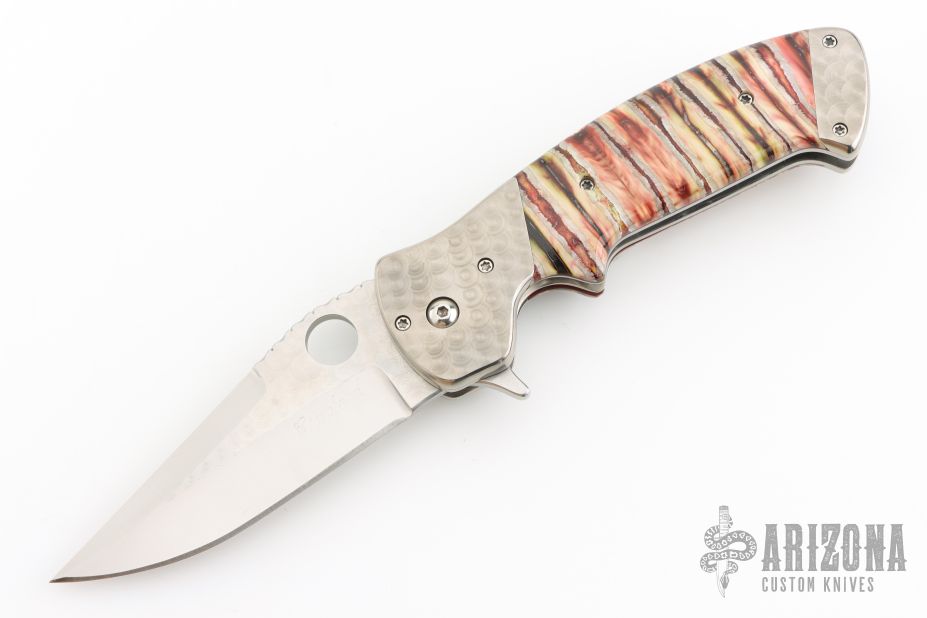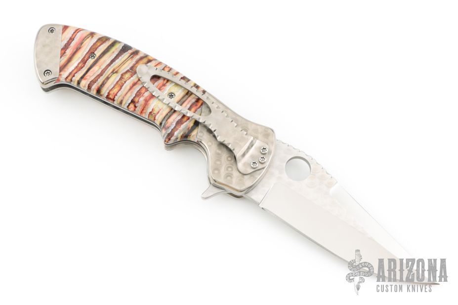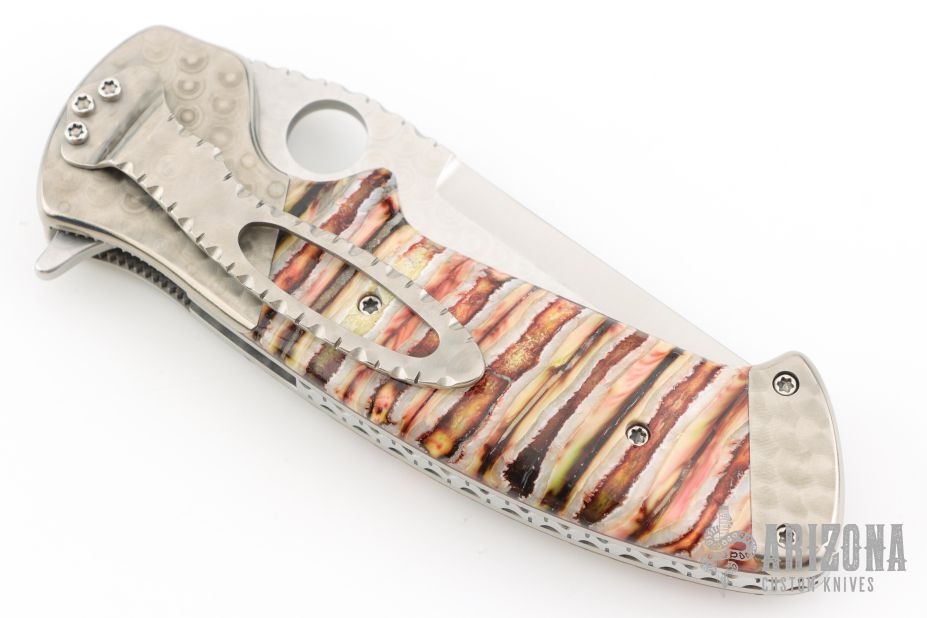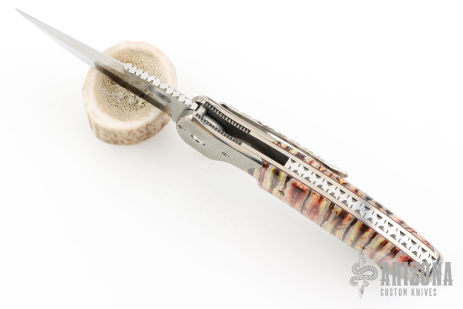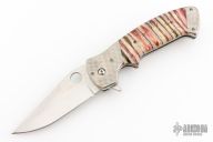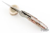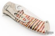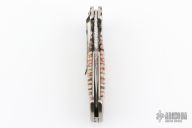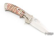 This Kasper by Crawford features a satin finished blade with a jeweled flats, thumbhole, flipper, fileworked thumbrest and false top edge. The handle has jeweled titanium dovetailed bolsters, mammoth tooth scales with red liners, titanium liners with jeweled interiors, fileworked stainless steel backspacer, tip down jeweled and fireworked titanium clip. Nice blade seating, detent and lockup. Excellent condition. Comes with a zippered case.