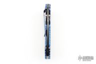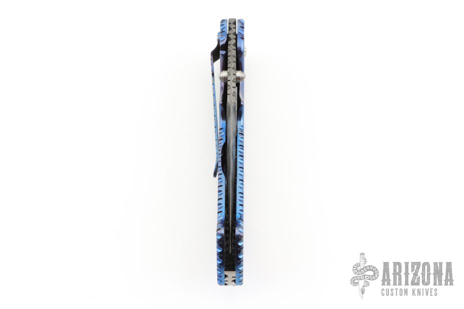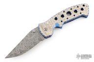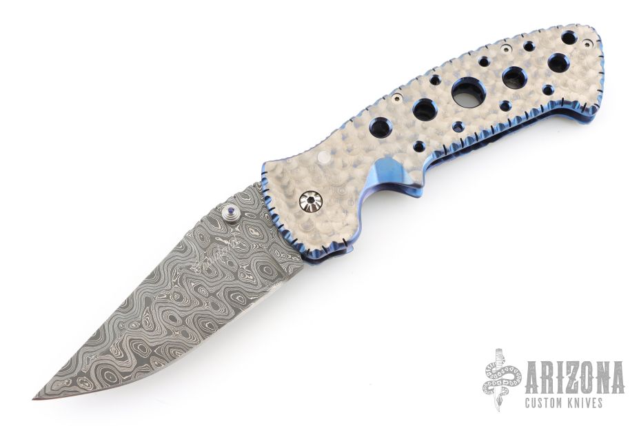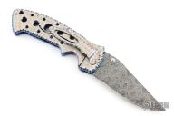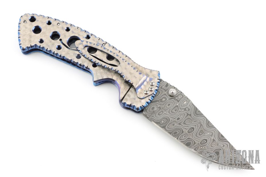 This Kasper Framelock from Crawford features a Damascus blade with false top edge, fileworked spine and dual thumbstuds with a blue stone inlay. The handle has a jeweled titanium frame with fileworked and anodized edges, fileworked stainless steel backspacer, tip down jeweled and fileworked titanium clip. Nice detent, lockup and blade seating. Comes with zipper case. Excellent condition.