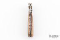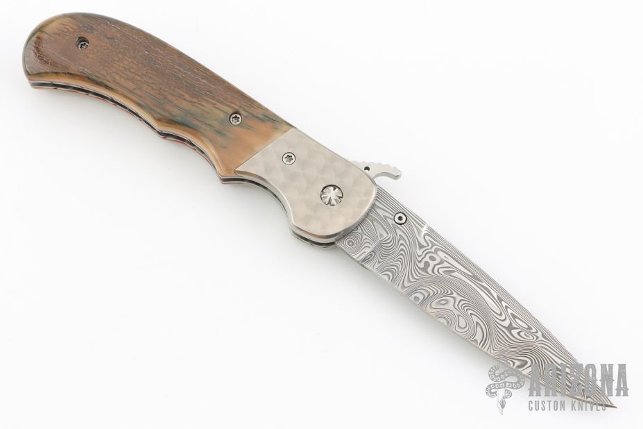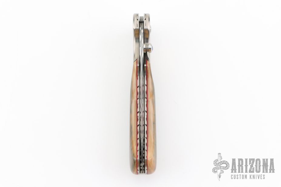 This Crawford Lock Folder by Crawford Knives features a Damasteel blade with a single thumbstud with blue stone inlay. The handle has jeweled titanium dovetailed bolsters, mammoth ivory scales with red liners, fileworked titanium liners with jeweled interiors, fileworked stainless steel backspacer with notched thumbrest. Smooth action, tight lockup and nice blade seating. Excellent condition. Comes with a zippered case.