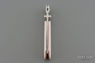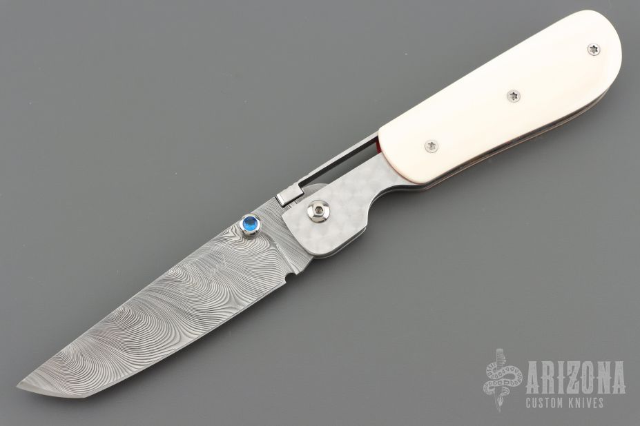 This Large Top Lock folder by Crawford Knives features a Damascus tanto blade with blue stone inlaid thumbstuds. The handle has an integral stainless steel frame with mammoth ivory scales with red liners. Includes a padded zippered case. Excellent condition.