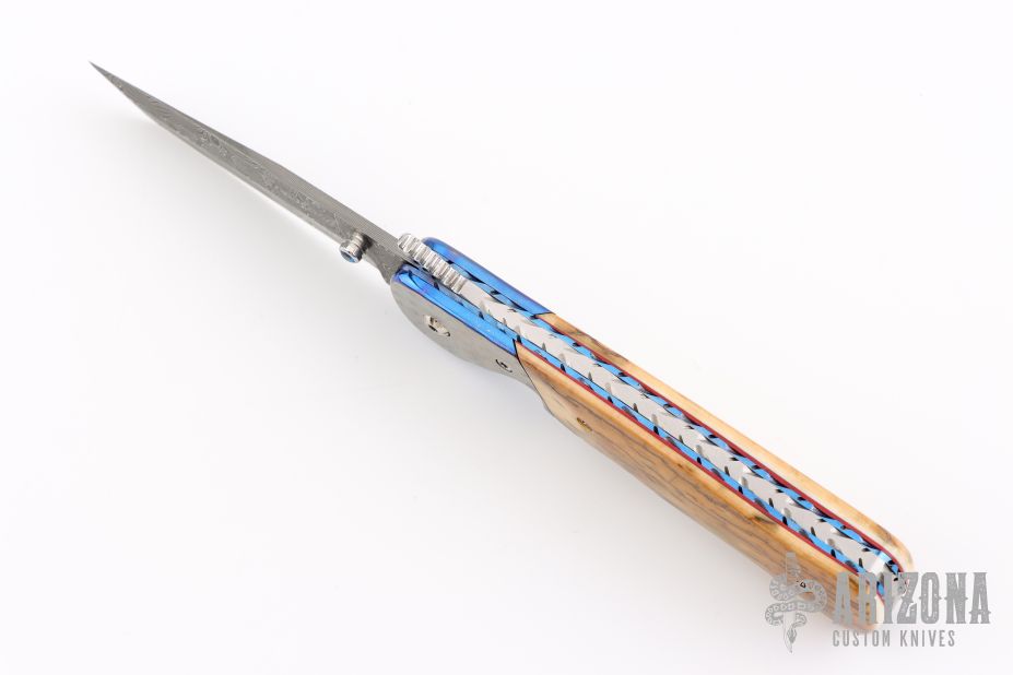 This Crawford Lock Folder by Crawford Knives features a Damascus blade with a single thumbstud with blue stone inlay. The handle has jeweled titanium dovetailed bolsters, mammoth ivory scales with red liners, fileworked titanium liners with jeweled interiors, fileworked stainless steel backspacer with notched thumbrest. Smooth action, tight lockup and nice blade seating. Excellent condition. Comes with a zippered case.
