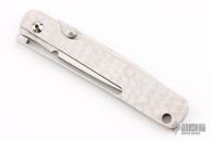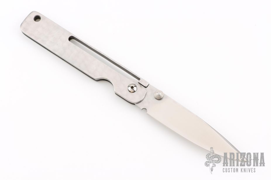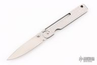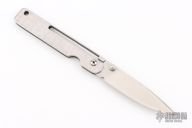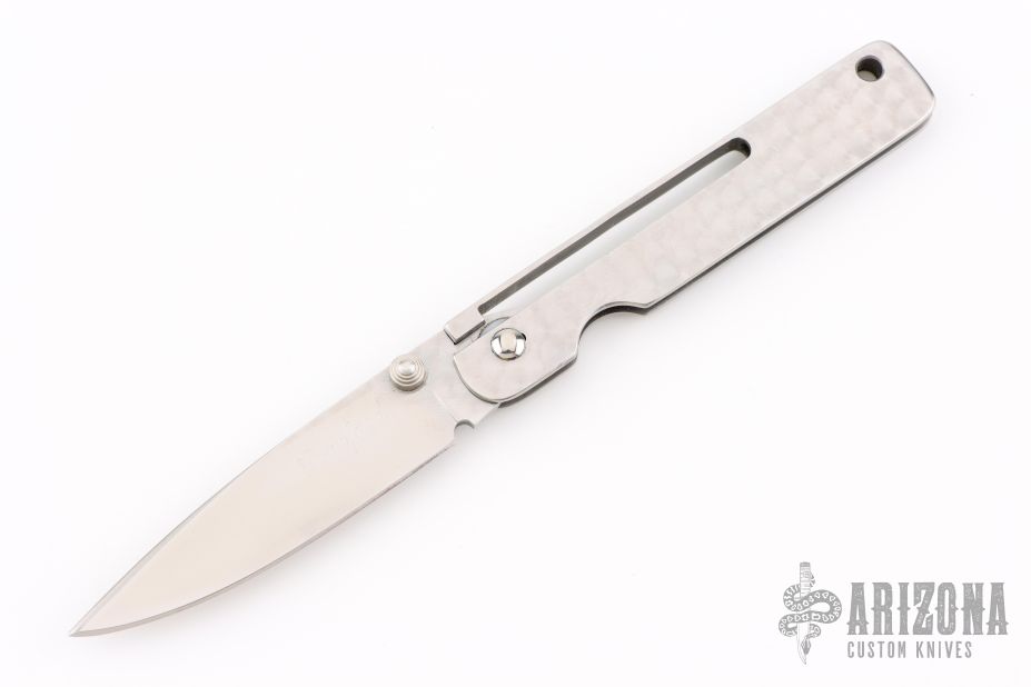 This folder by Pat Crawford has a top lock mechanism that engages when the folder is opened. To close, pull up on the top lock to disengage it and fold the blade closed. Integral jeweled stainless steel handle with a satin finished blade. Dual thumbstuds. Excellent condition.