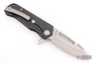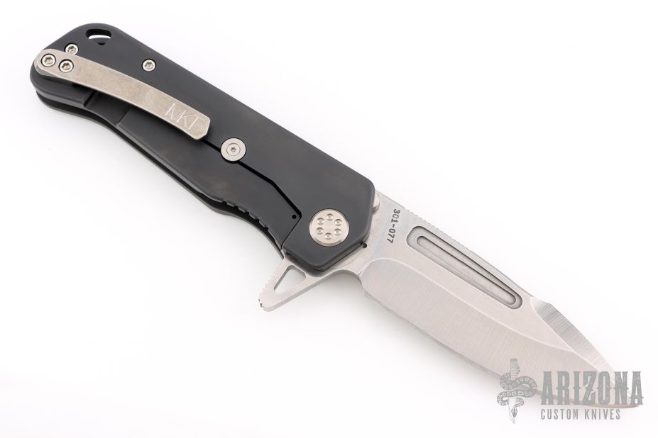 This Proxima by Medford Knife and Tool featured a stonewashed spear point blade with fullers and a notched flipper tab. The handle is composed of black DLC coated titanium and a stonewashed tip up pocket clip and a lanyard hole. Includes the original box, zippered case and papers dated July 30, 2024. Excellent Condition.