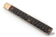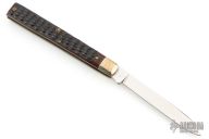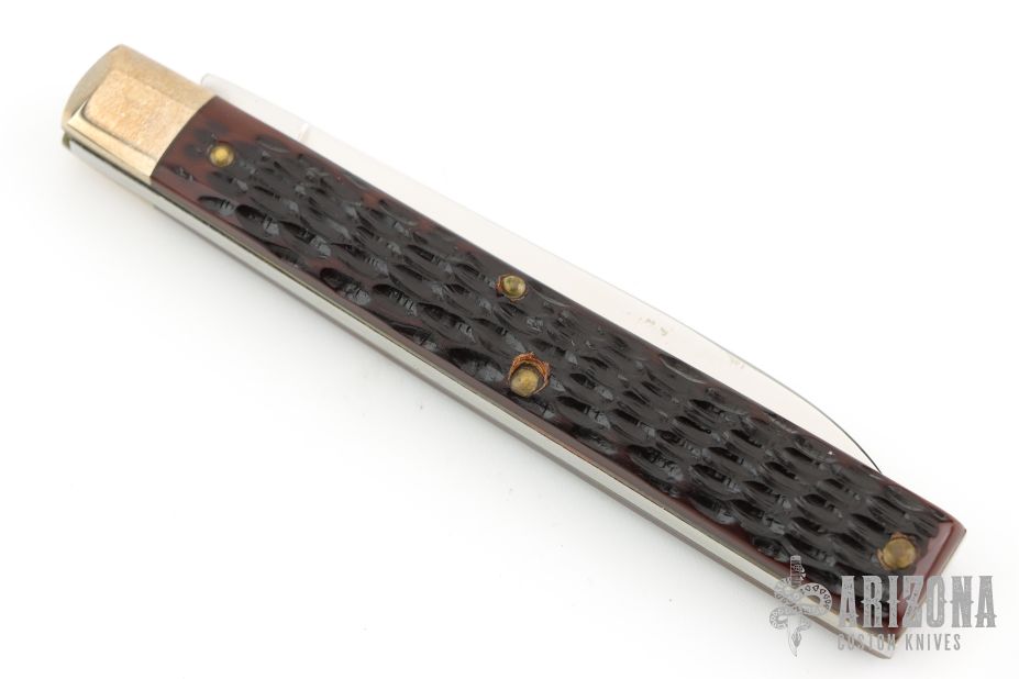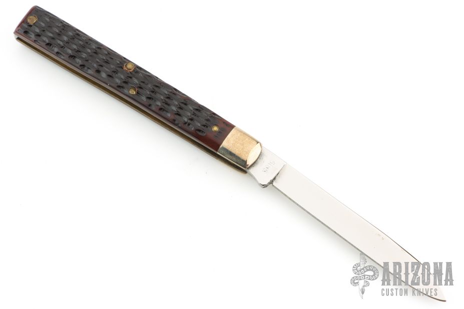 This Doctors Knife slip joint by Case Knives features a drop point blade with nail nick. The handle has nickel silver double bolsters, brass liners, jigged Delrin covers, brass liners and stainless spring. Has a few light scratches, otherwise good condition.
