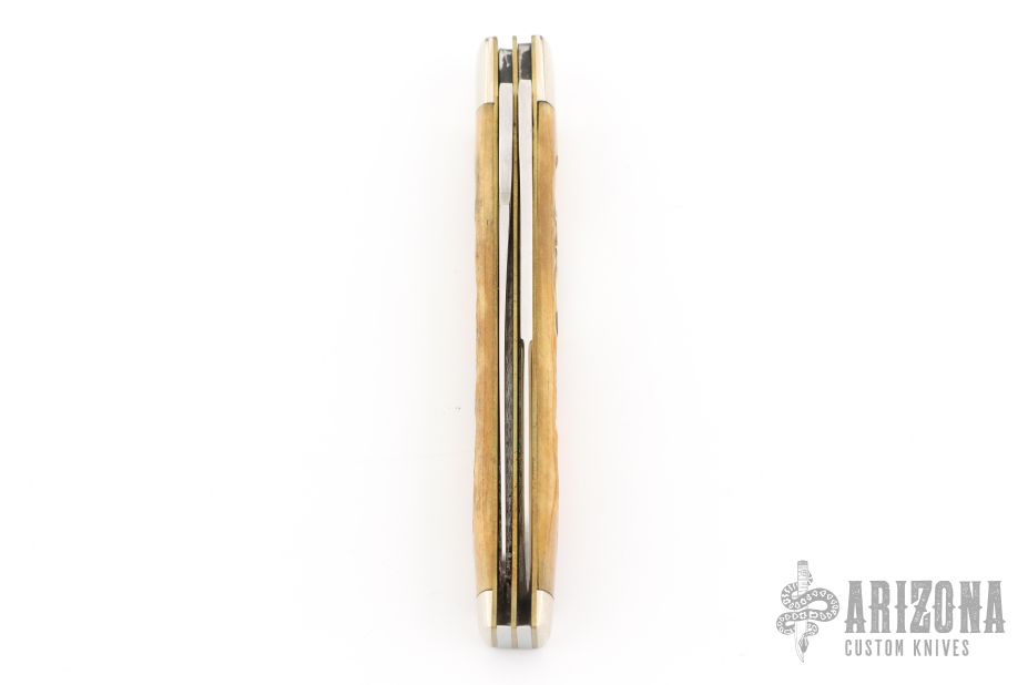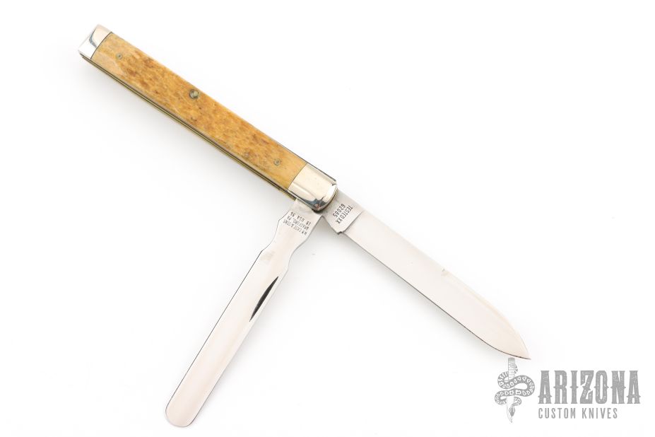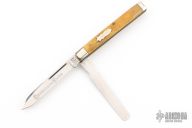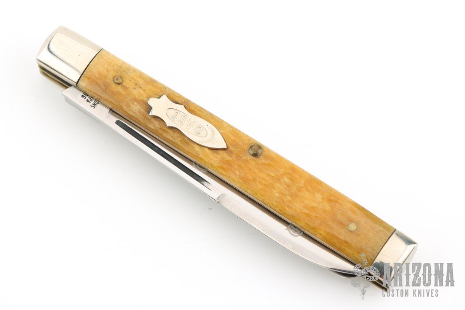 This Doctors Knife slip joint by Case Knives features a drop point blade with nail nick and a spatula blade with nail nick. The handle has nickel silver bolsters, brass liners, yellow jigged bone covers, and stainless springs. Has a few light scratches, otherwise good condition.