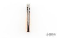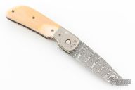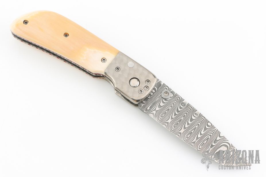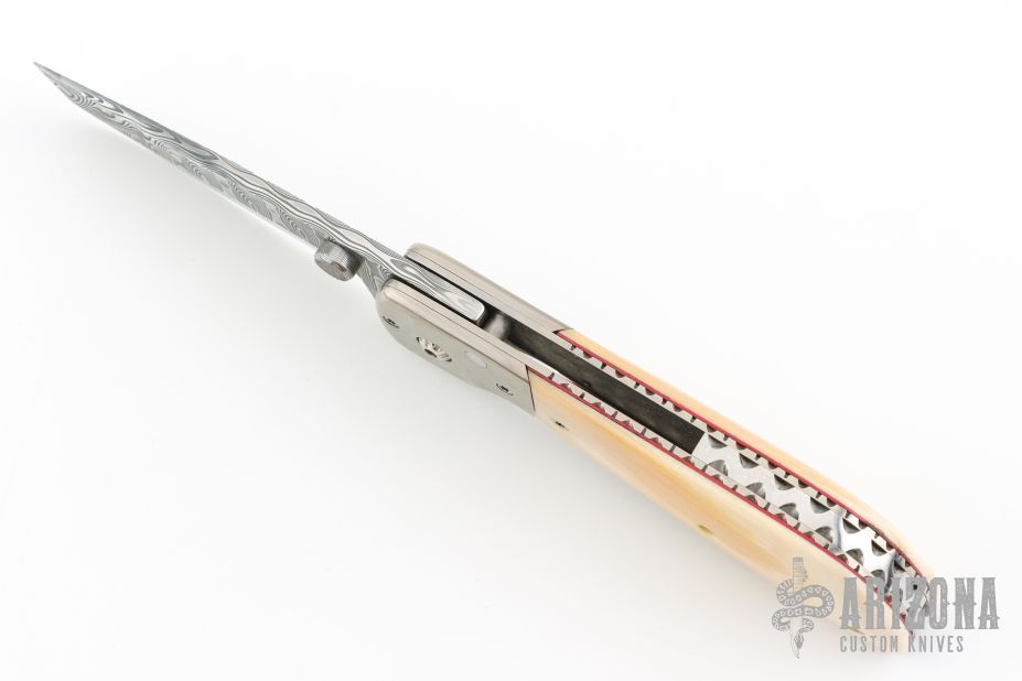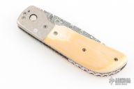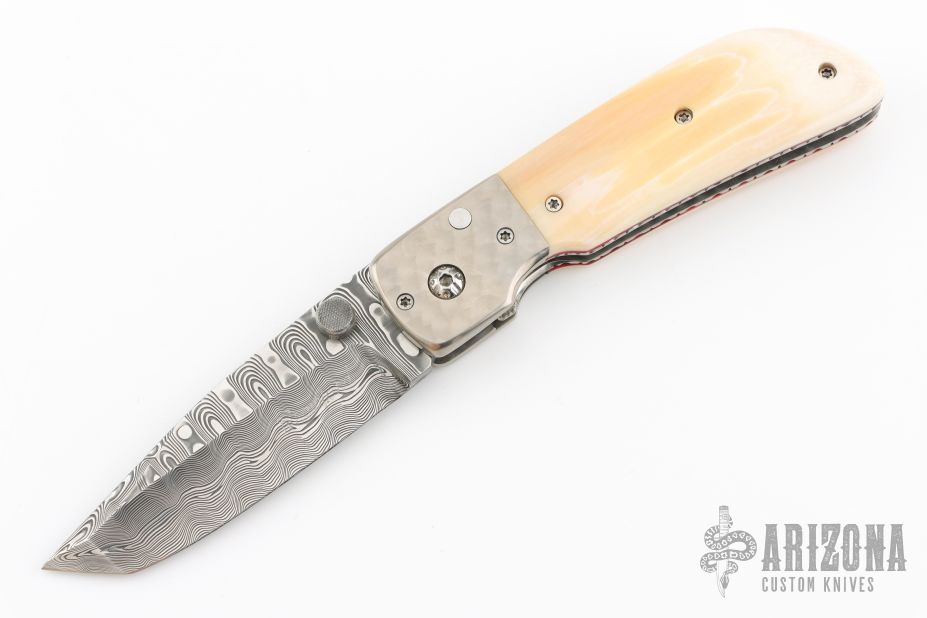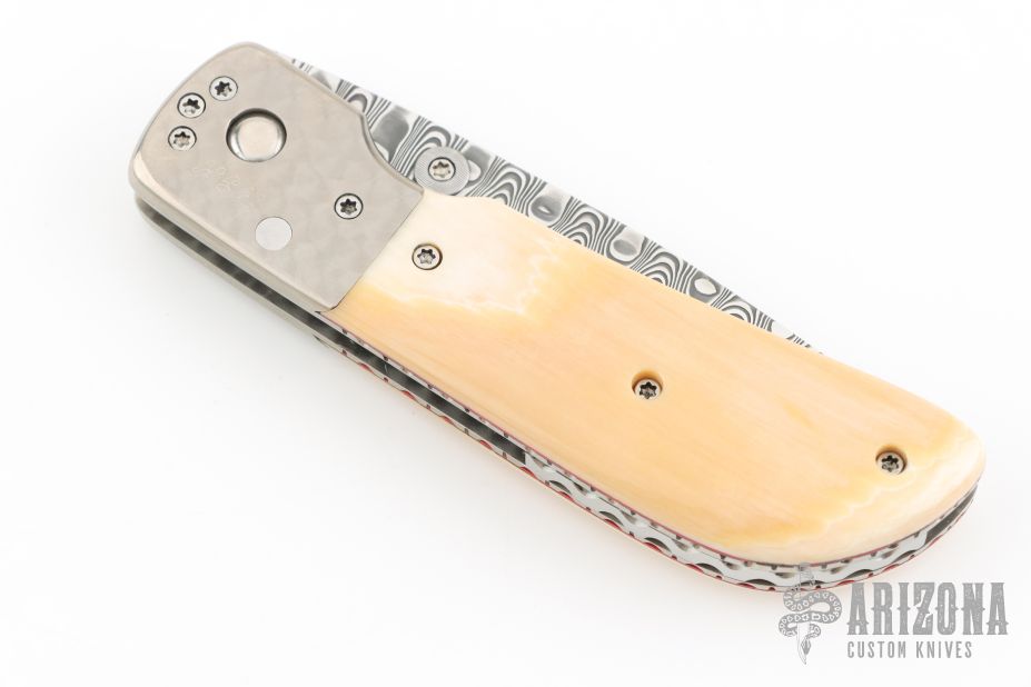 This Combat Tanto by Crawford Knives features a Damascus chisel ground tanto blade with a single checkered thumbstud, the b-side of the blade is hollow ground. The handle has jeweled titanium dovetailed bolsters, mammoth ivory scales with red liners, fileworked and jeweled titanium liners, fileworked stainless steel backspacer. Nice detent, lockup and blade seating. Excellent condition. Comes with a zippered case.