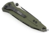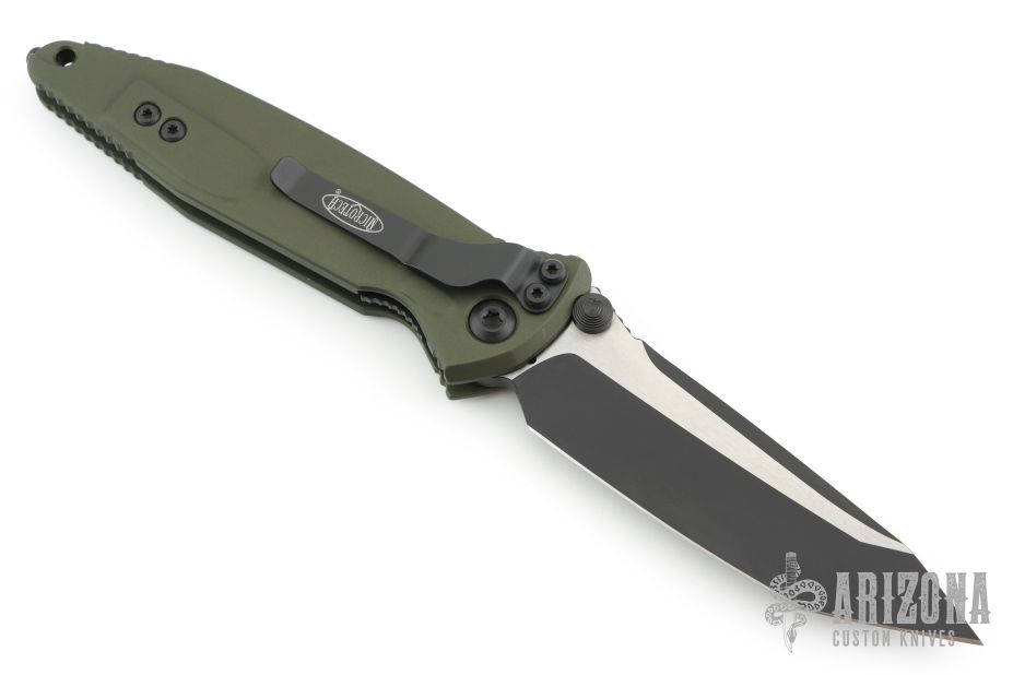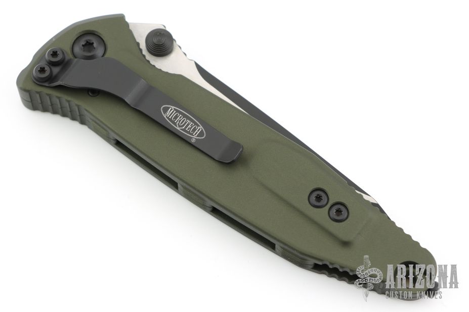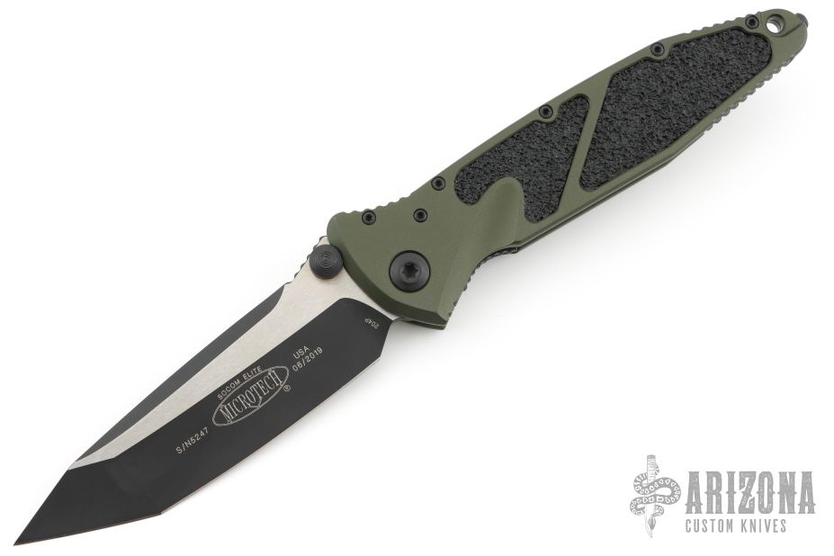 This Socom Elite manual linerlock folder by Microtech Knives has a two-tone black tanto blade with notched thumbrest and dual thumbstuds. Has an OD Green aluminum handle with non-slip inlays, tip down black stainless steel clip and hardware. Serial number 5247 and dated 06/2019. Comes with original box and papers. Excellent condition.