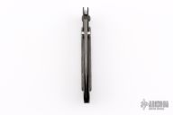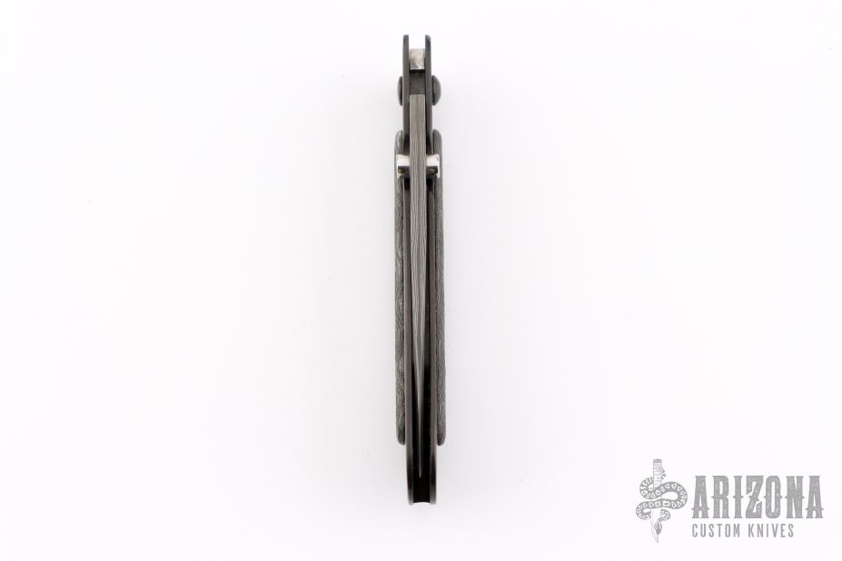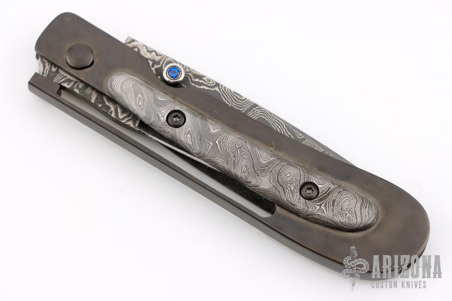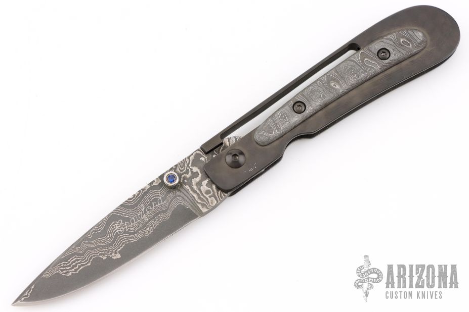 This Large Top Lock folder by Crawford Knives features a San Mai Damascus blade with blue stone inlaid thumbstuds. The handle has an integral DLC jeweled stainless steel frame with Damascus scales. Includes a padded zippered case. Has a couple light scratches, otherwise excellent condition.
