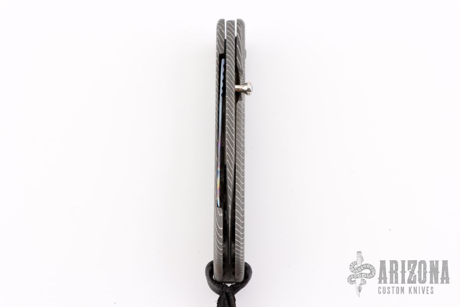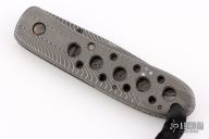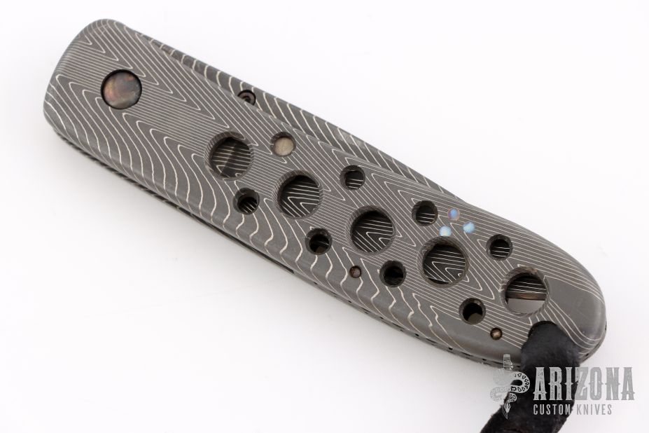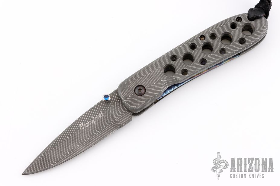 This Leopard cub folder from Crawford features a Damascus blade with a single thumbstud with a blue stone inlay. The handle has a Damascus frame with a titanium liner and a fileworked stainless steel backspacer. Nice detent, lockup and blade seating. Excellent Condition. Comes with a zippered case.