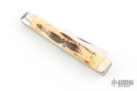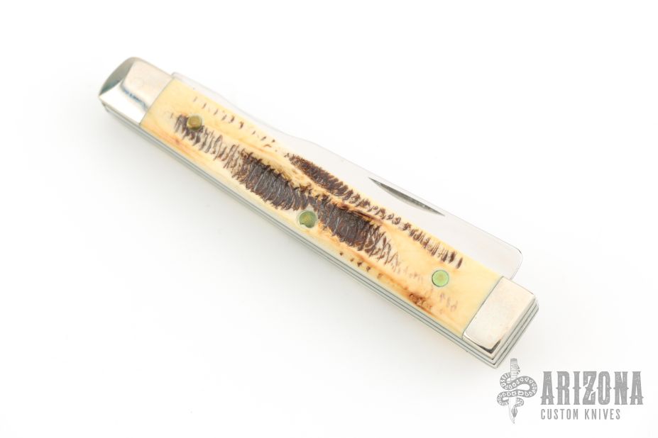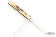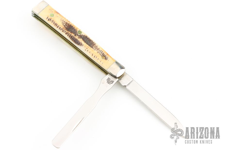 This Baby Doctors Knife slip joint by Case Knives features a drop point blade with nail nick and spatula blade with nail nick. The handle has nickel silver double bolsters, brass liners, stag covers, brass liners and stainless springs. Comes with original box. Has a few light scratches, otherwise excellent condition.