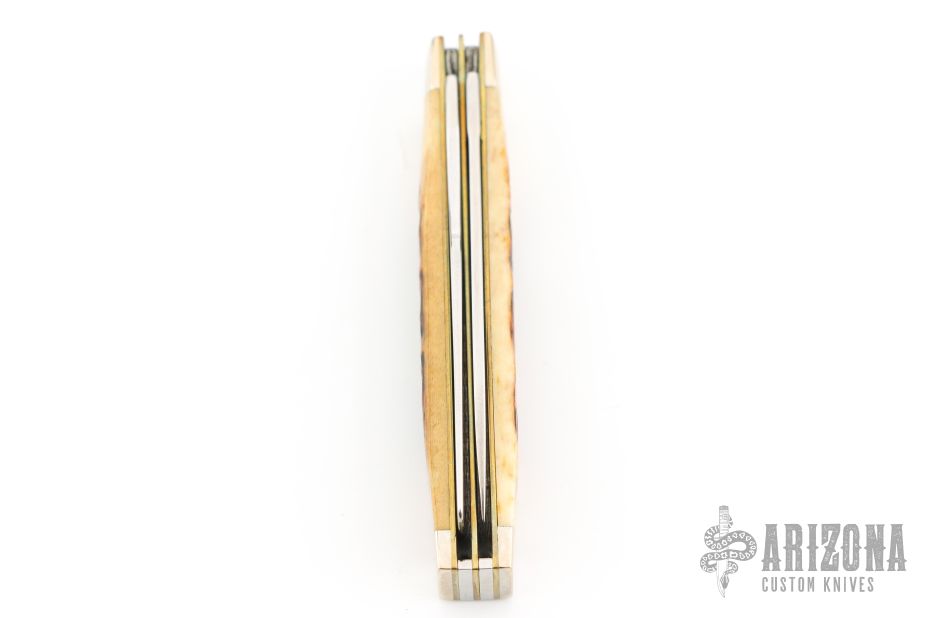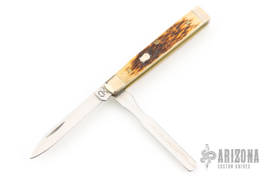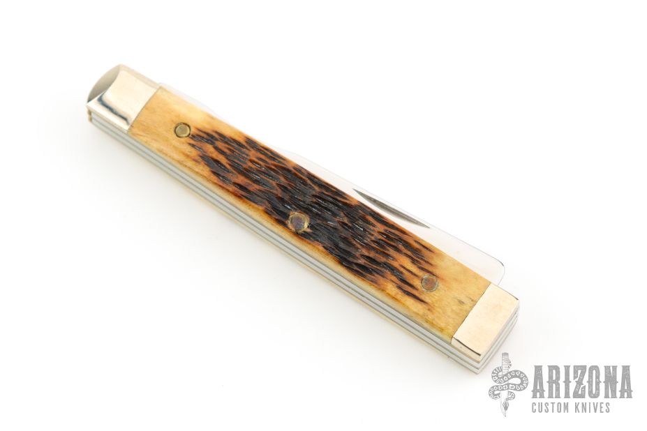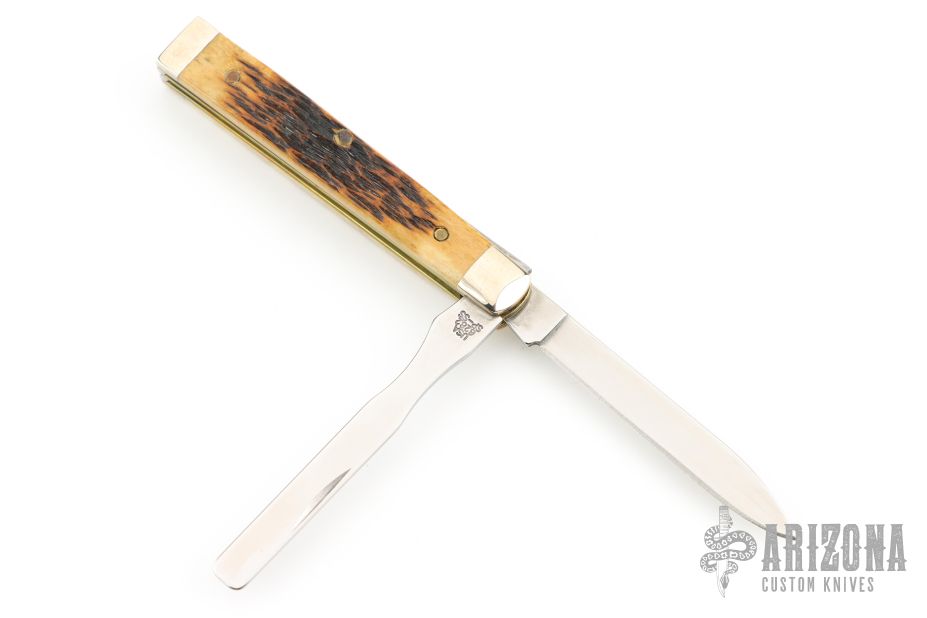 This Baby Doctors Knife slip joint by Case Knives features a drop point blade with nail nick and spatula blade with nail nick. The handle has nickel silver double bolsters, brass liners, stag covers, brass liners and stainless springs. Has a few light scratches, otherwise excellent condition.