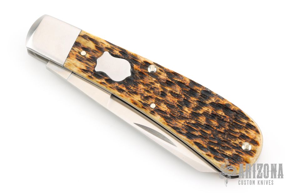 A Case and Tony Bose collaboration from 2006, this Cotton Sampler slipjoint has a satin finish blade with nail nick. Stainless bolsters, burnt stag covers, stainless liners and spring. Case number TB612006. Comes with original box, and zipper case signed by Tony Bose. Has a couple light scuffs, otherwise Excellent condition.