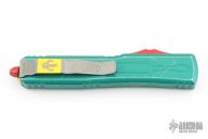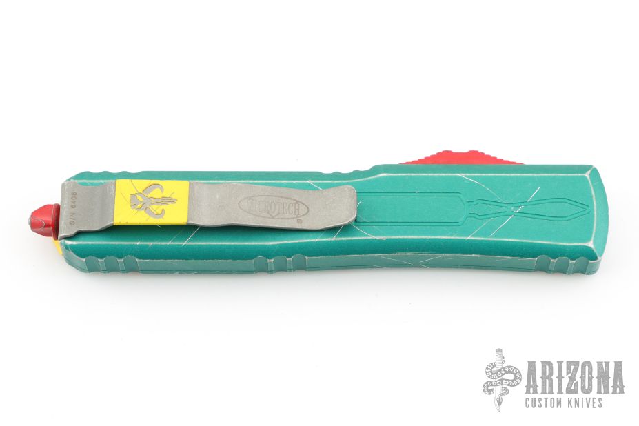 This Star Wars themed Ultratech by Microtech knives features a standard tanto blade with fullers and apocalyptic finish. The handle has a green battle worn aluminum frame with red and yellow hardware. Comes with original box and papers. Dated 06/2022 #6408. Excellent condition.