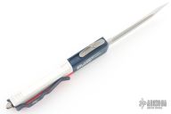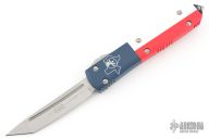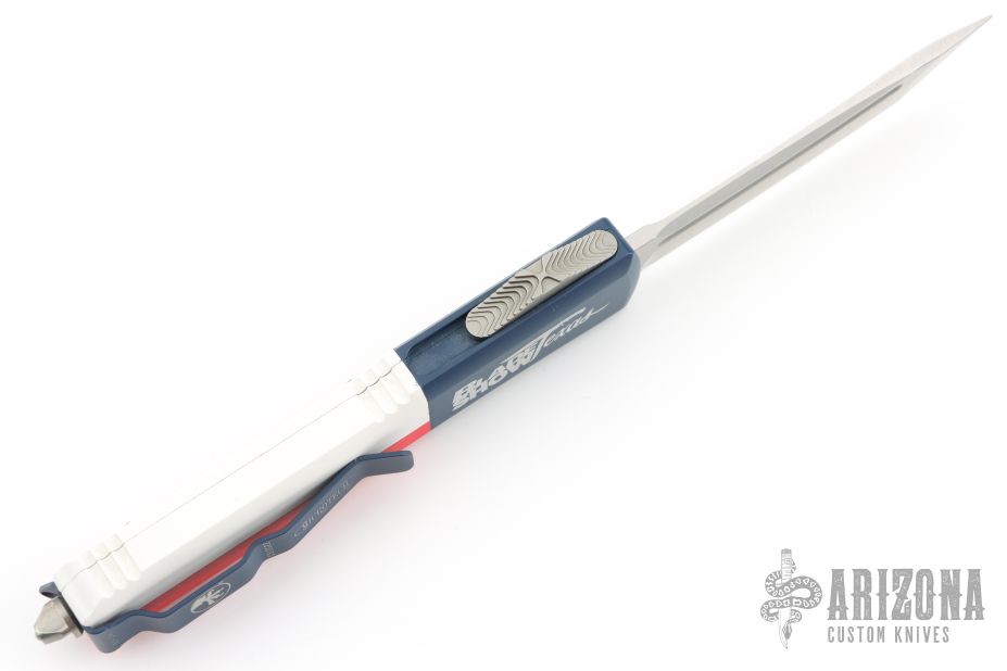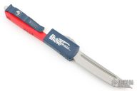 This Ultratech OTF automatic by Microtech features a stonewashed tanto blade with satin finished flats. Red, white and blue aluminum contoured frame with a blue tip down stainless steel clip. Dated 03/2022 and #045. Excellent condition. Comes with original box and papers.