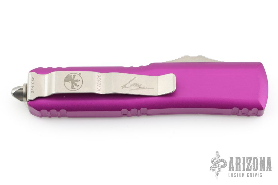 This UTX-85 by Microtech features a stonewashed tanto blade with satin flats and fullers. The handle has a violet aluminum frame with blasted hardware and tip down clip. S/N 062 and dated 10/2022. Comes with original box and papers. Excellent condition.