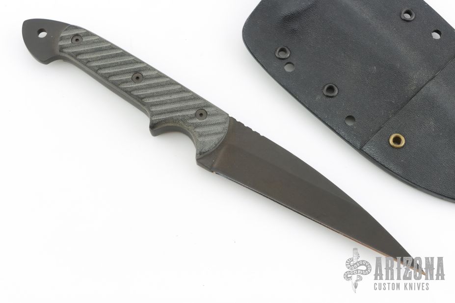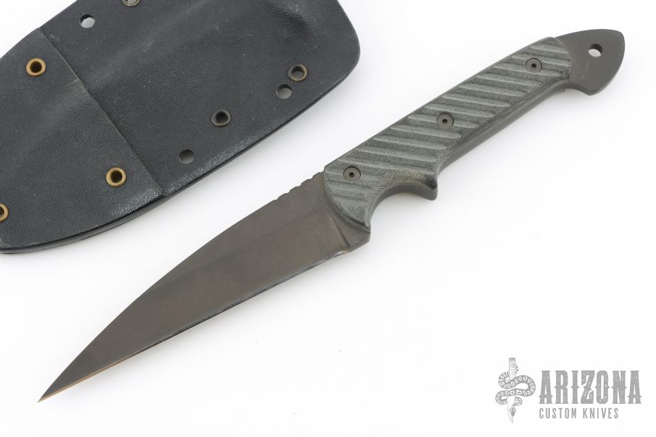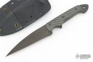 This Dragon by Crawford Knives was Bob Kasper's last fixed blade design, it features a black bead blasted wharncliffe blade with notched thumbrest, .260" blade stock and 1.116" blade depth, full tang construction. The handle has black linen micarta scales with grooves. Comes with kydex sheath. Excellent condition.