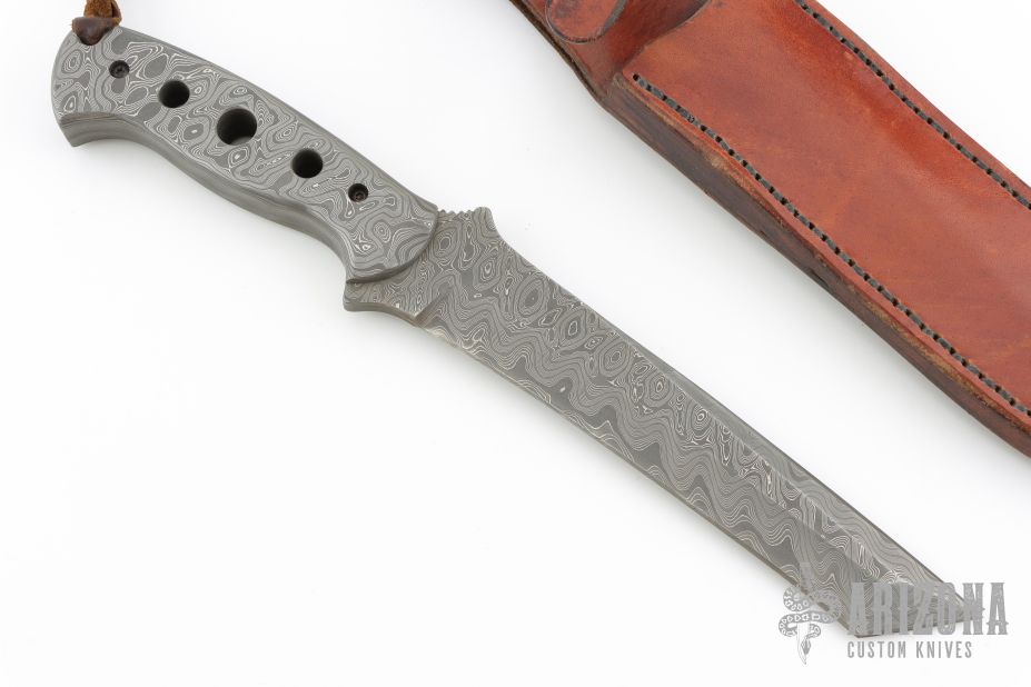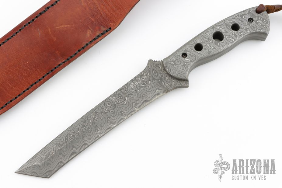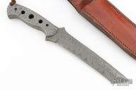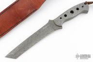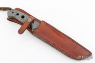 This knife from Crawford Knives features a Damascus blade with false top edge and notched thumbrest, .249" blade stock and 1.275" blade depth, full tang construction. The handle has Damascus scales. Comes with a brown leather sheath with belt loop. Excellent condition.